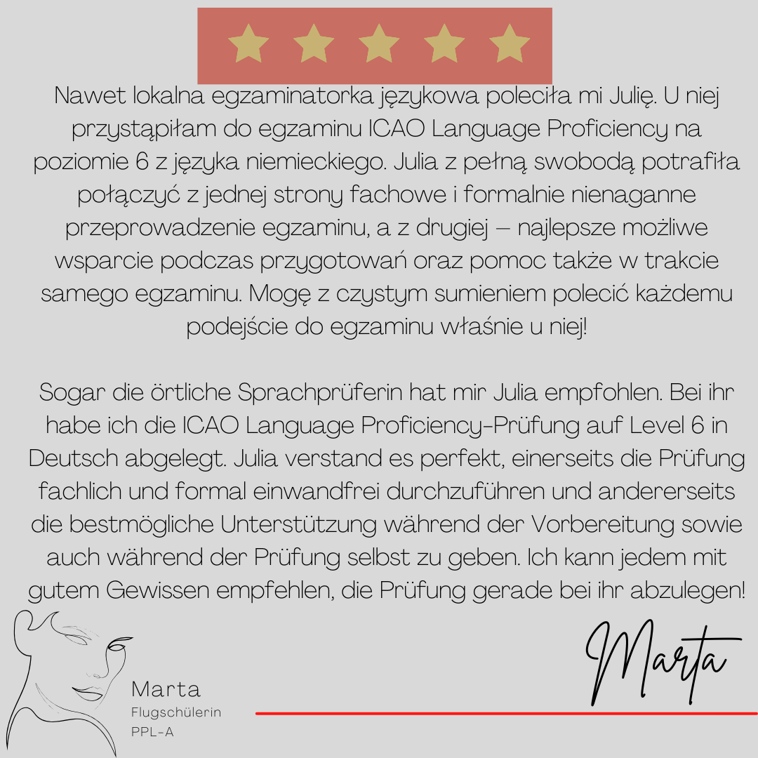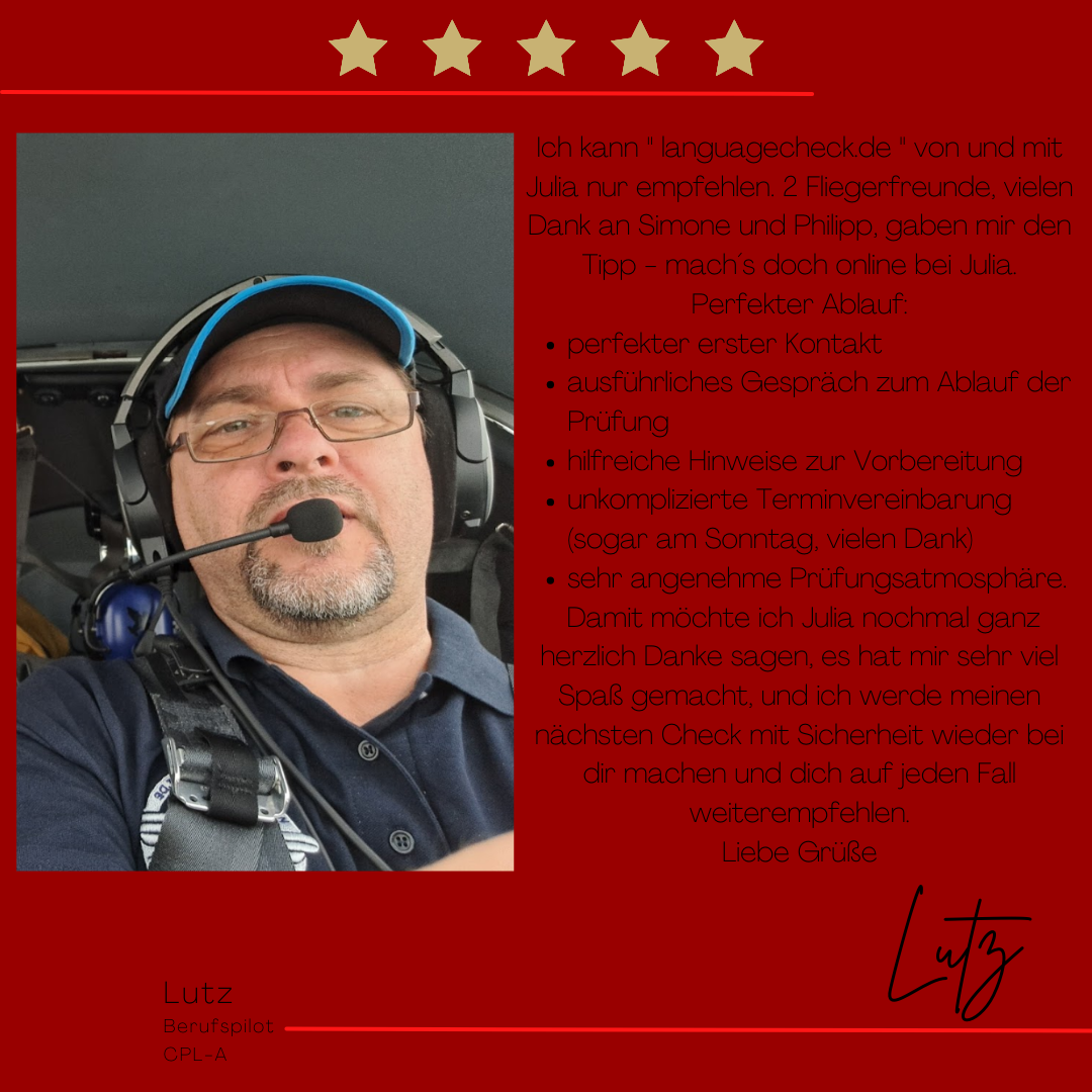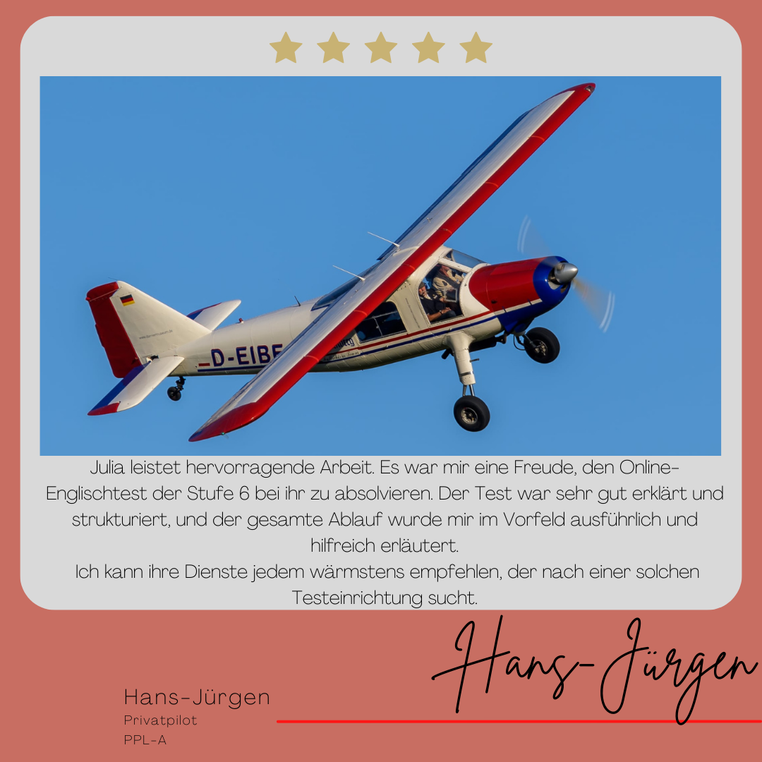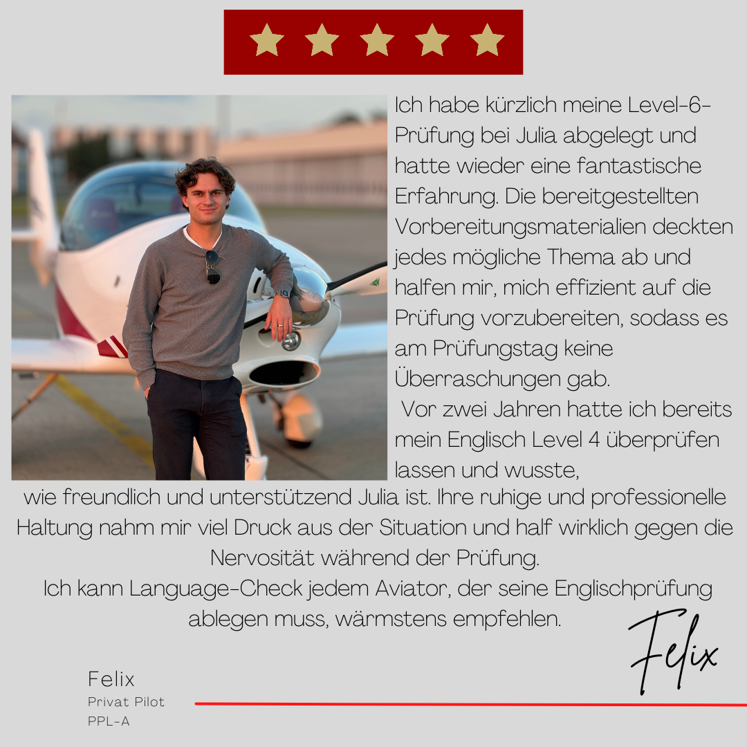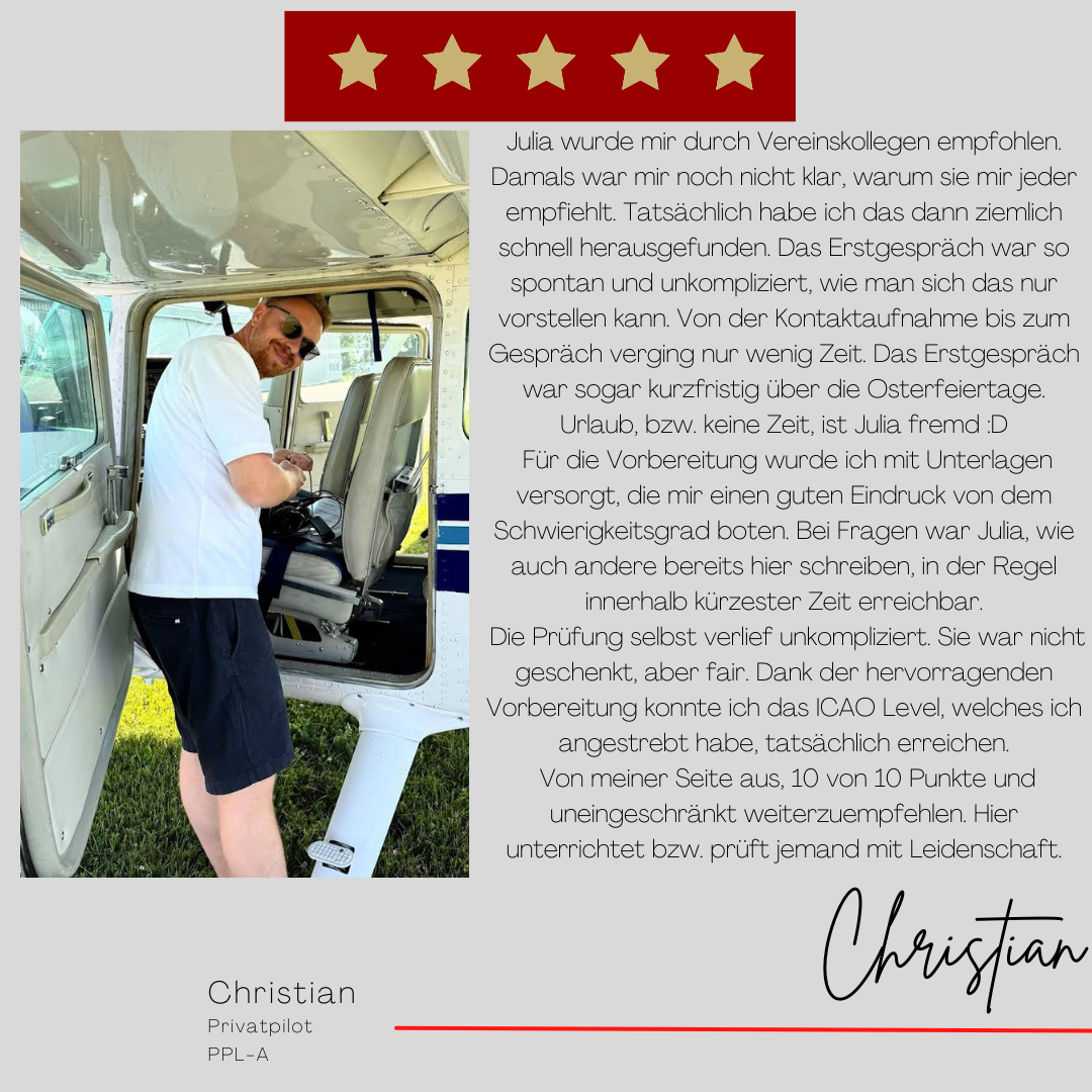 Mein Name ist Julia Engster-Juhas. Ich spreche fließend Englisch auf Expertenniveau (Level 6). Nach meinem Lehramtsstudium begann ich mit dem Flugschein. Nachdem ich diesen absolviert hatte, vertiefte ich meine Kenntnisse in der Flugtheorie und wurde Theorielehrerin.