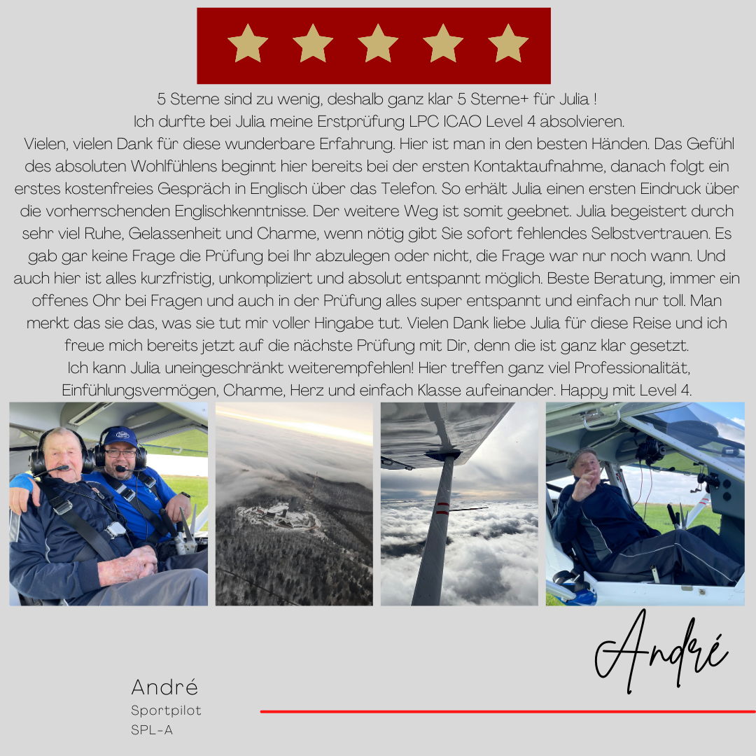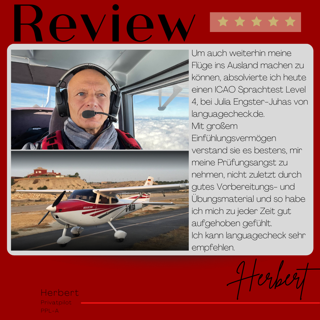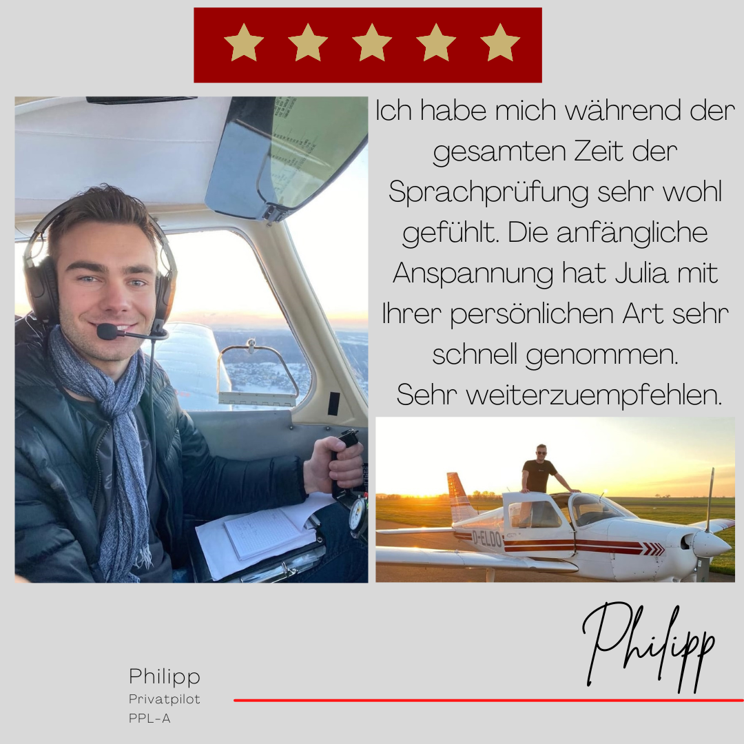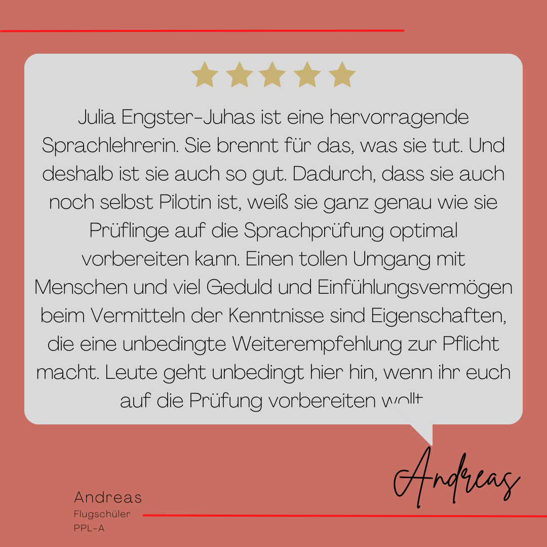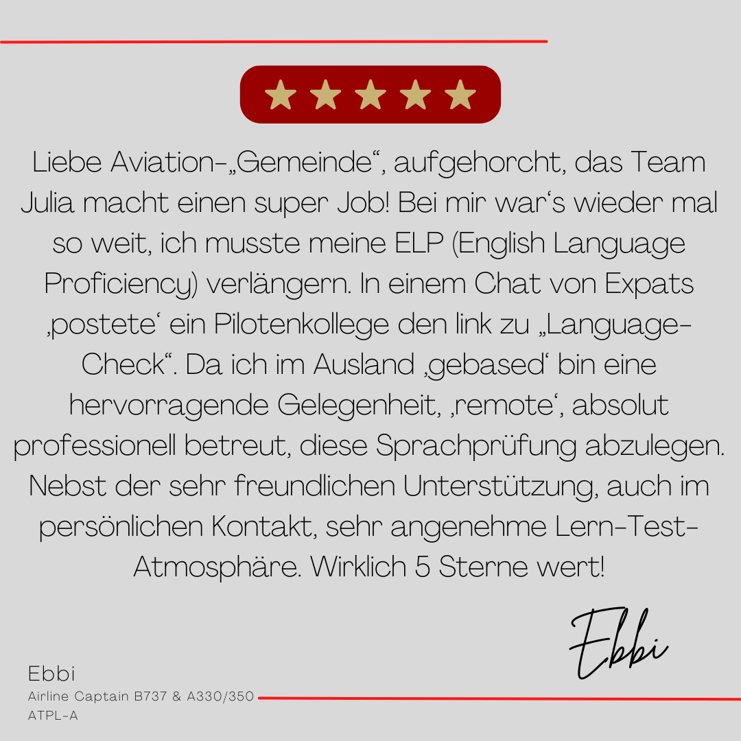 Mein Name ist Julia Engster-Juhas. Ich spreche fließend Englisch auf Expertenniveau (Level 6). Nach meinem Lehramtsstudium begann ich mit dem Flugschein. Nachdem ich diesen absolviert hatte, vertiefte ich meine Kenntnisse in der Flugtheorie und wurde Theorielehrerin.