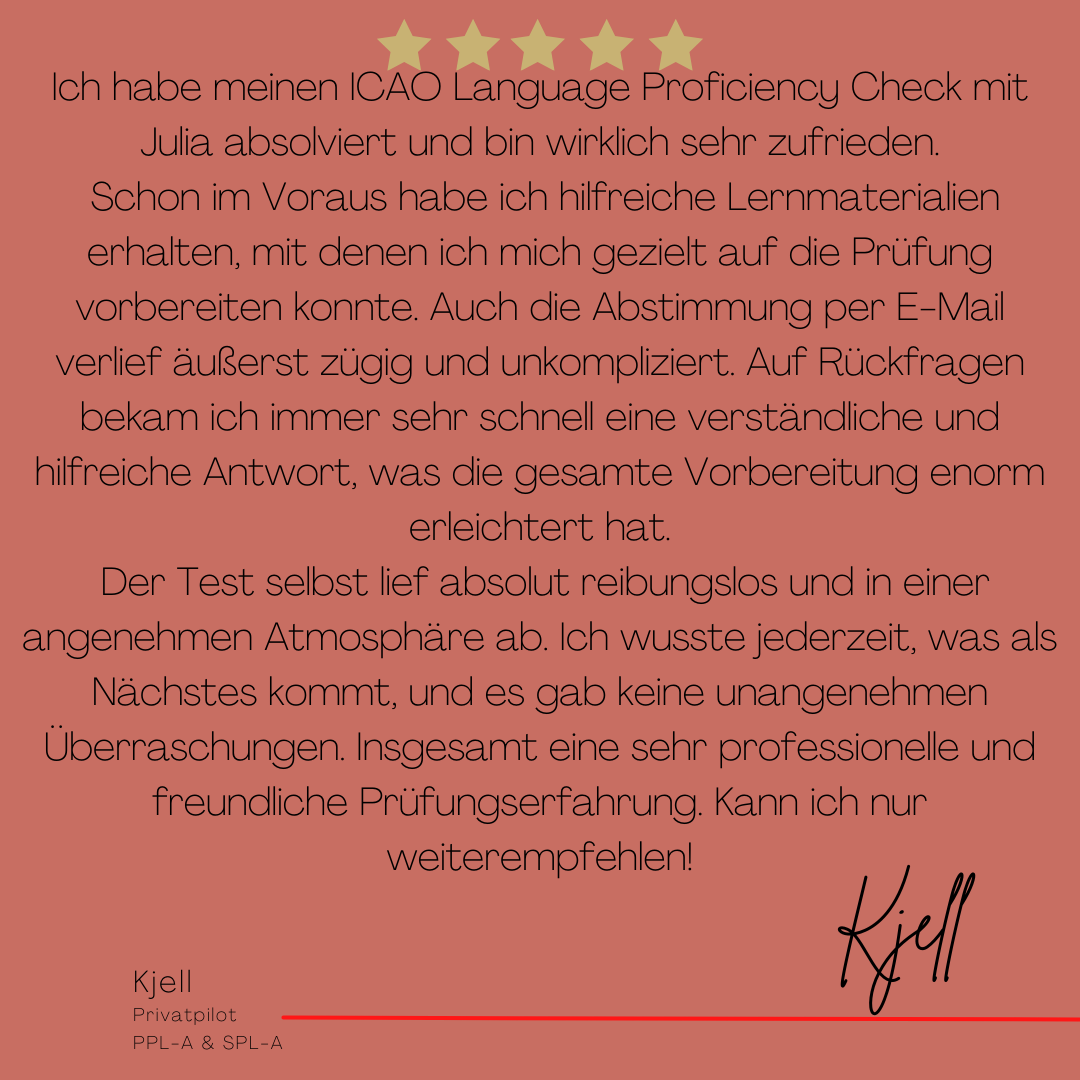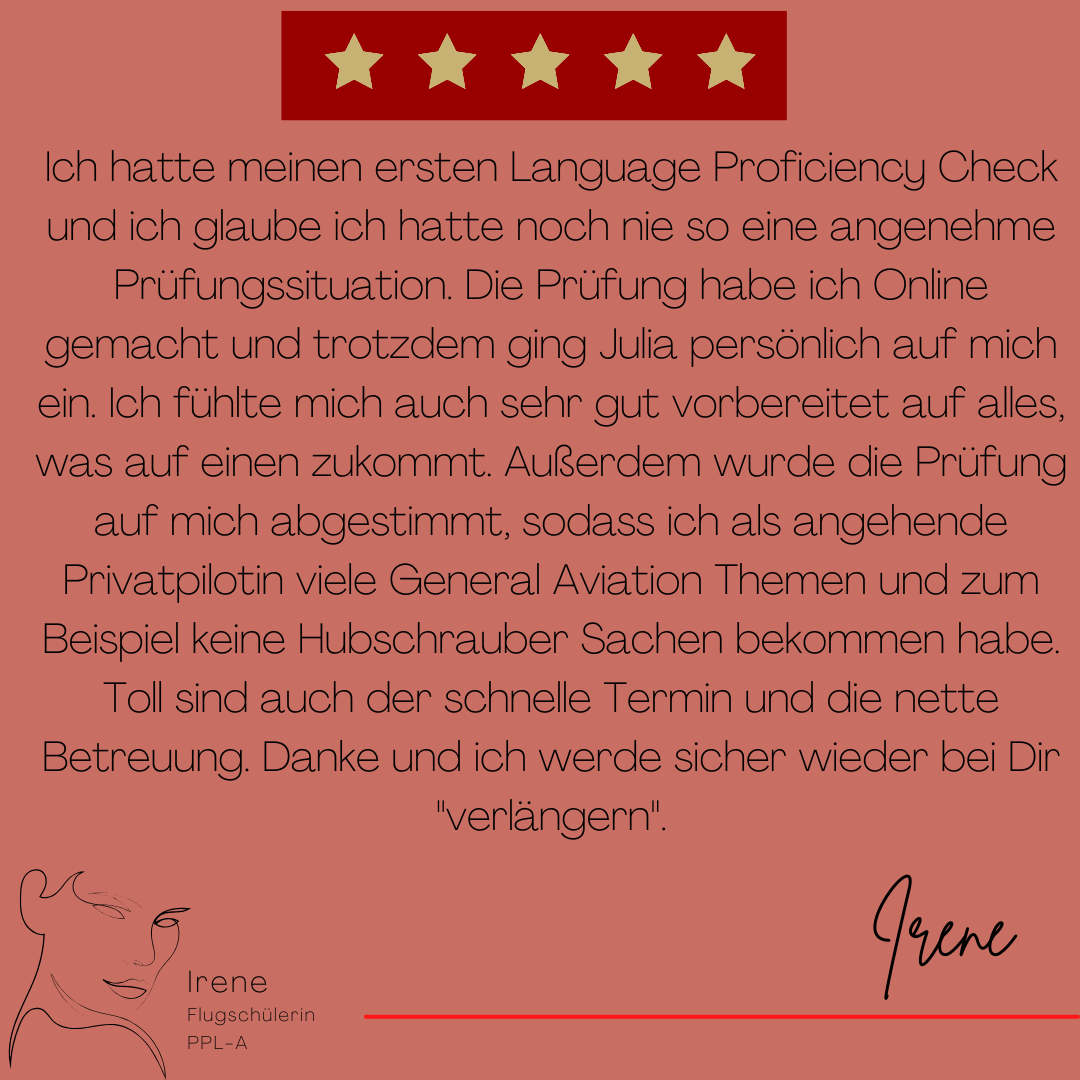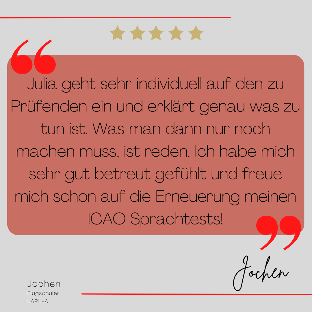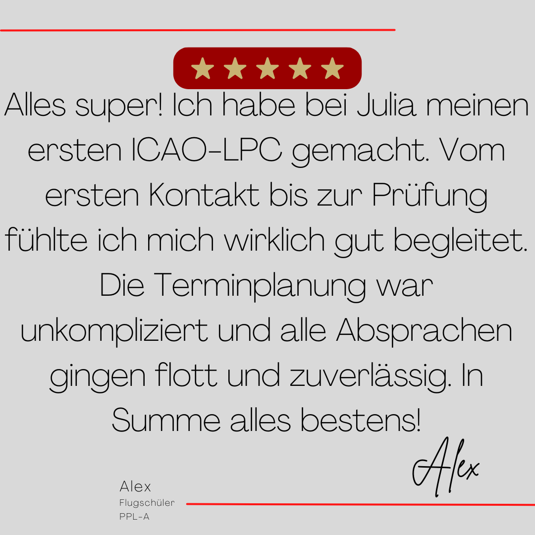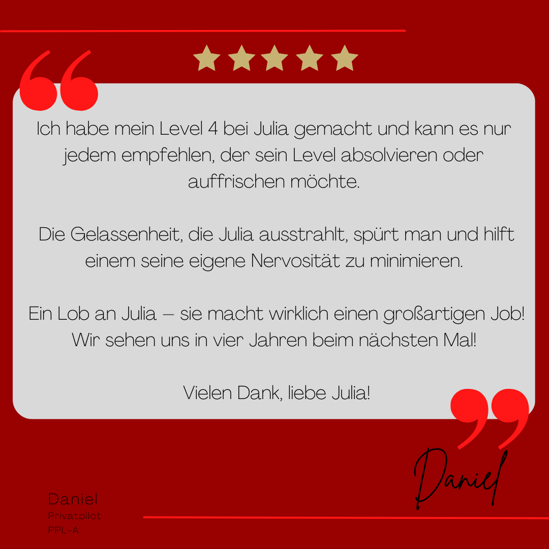 Mein Name ist Julia Engster-Juhas. Ich spreche fließend Englisch auf Expertenniveau (Level 6). Nach meinem Lehramtsstudium begann ich mit dem Flugschein. Nachdem ich diesen absolviert hatte, vertiefte ich meine Kenntnisse in der Flugtheorie und wurde Theorielehrerin.