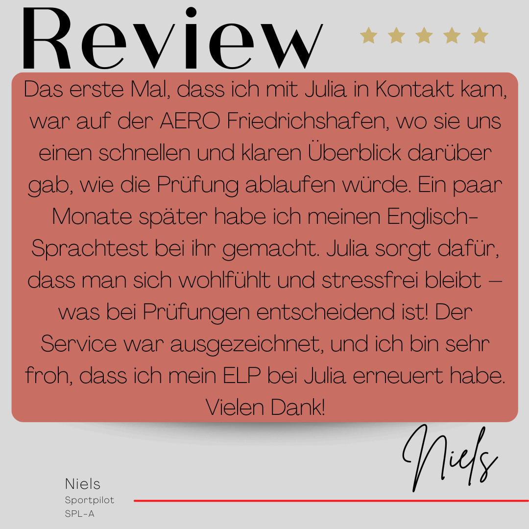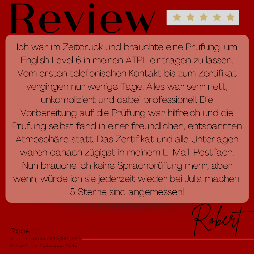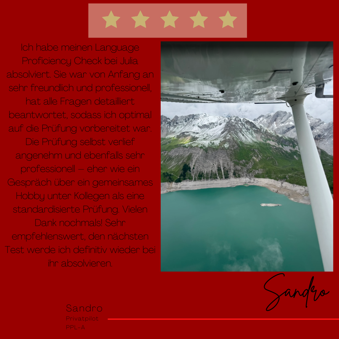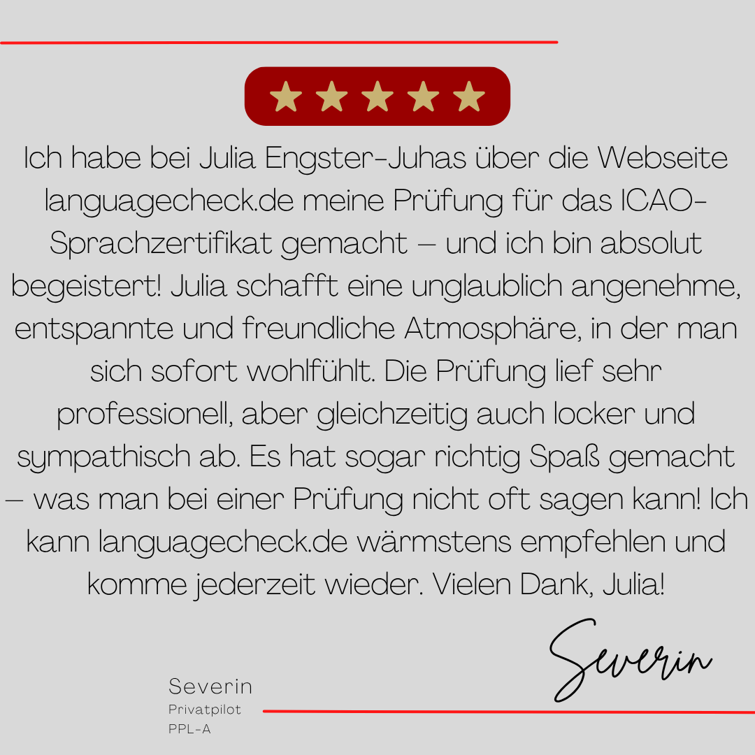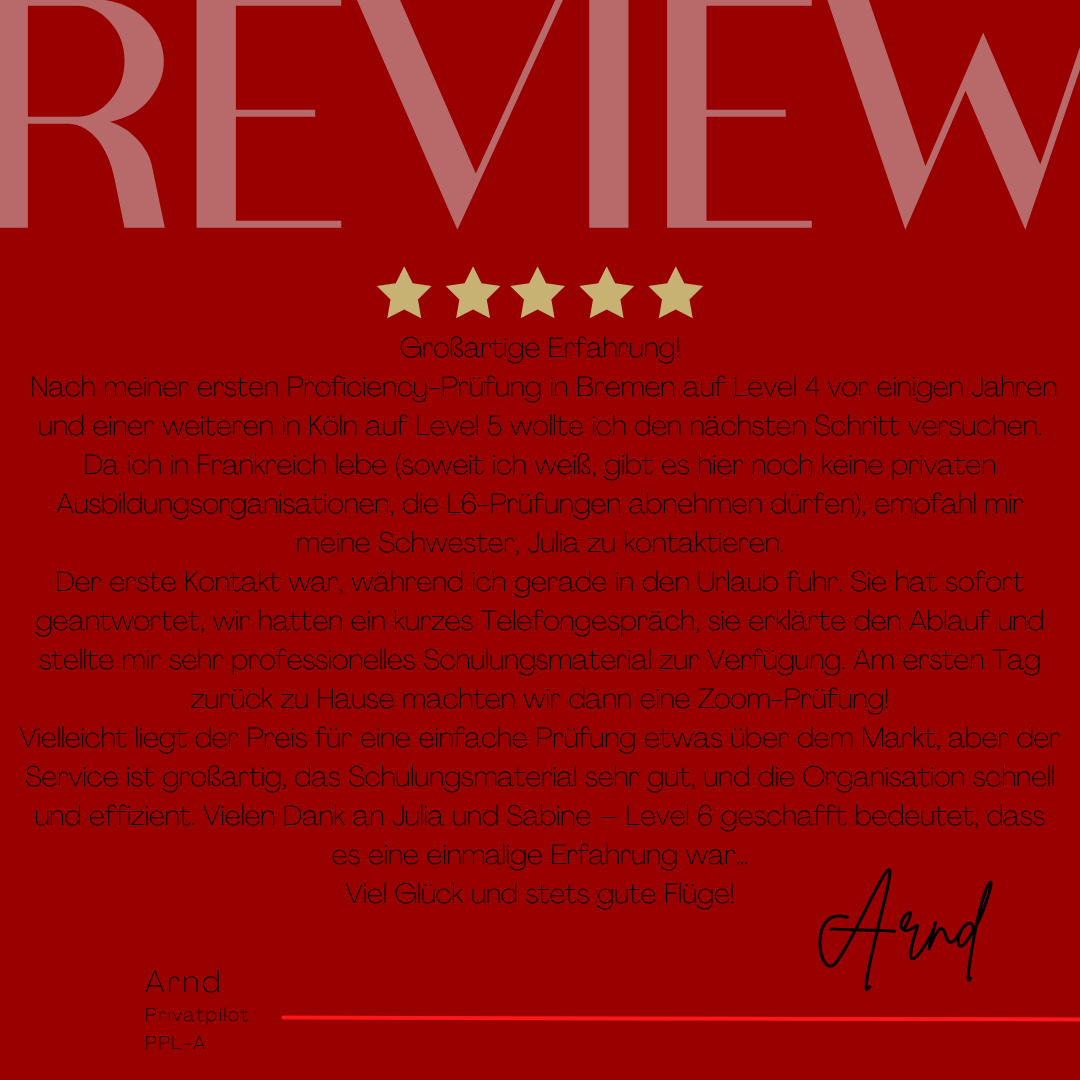 Mein Name ist Julia Engster-Juhas. Ich spreche fließend Englisch auf Expertenniveau (Level 6). Nach meinem Lehramtsstudium begann ich mit dem Flugschein. Nachdem ich diesen absolviert hatte, vertiefte ich meine Kenntnisse in der Flugtheorie und wurde Theorielehrerin.