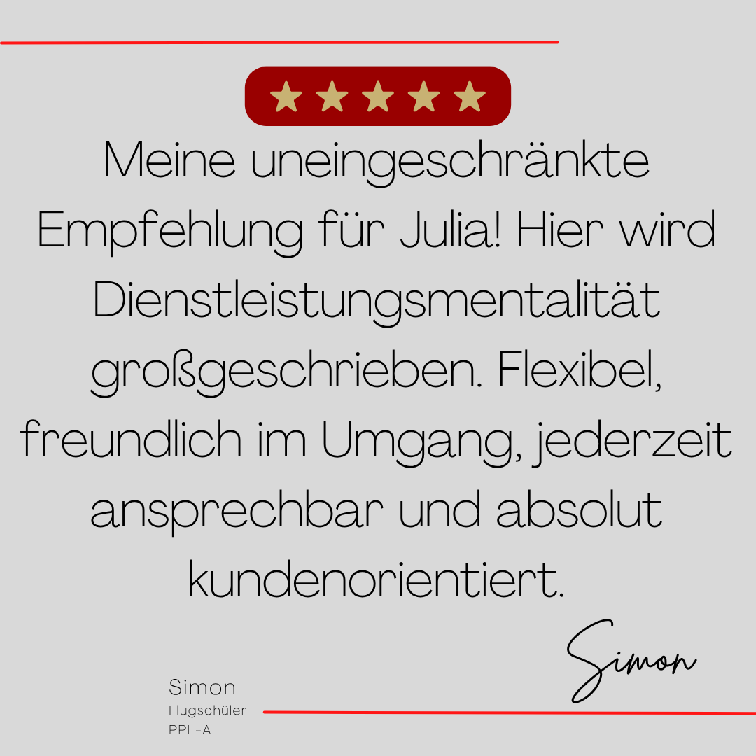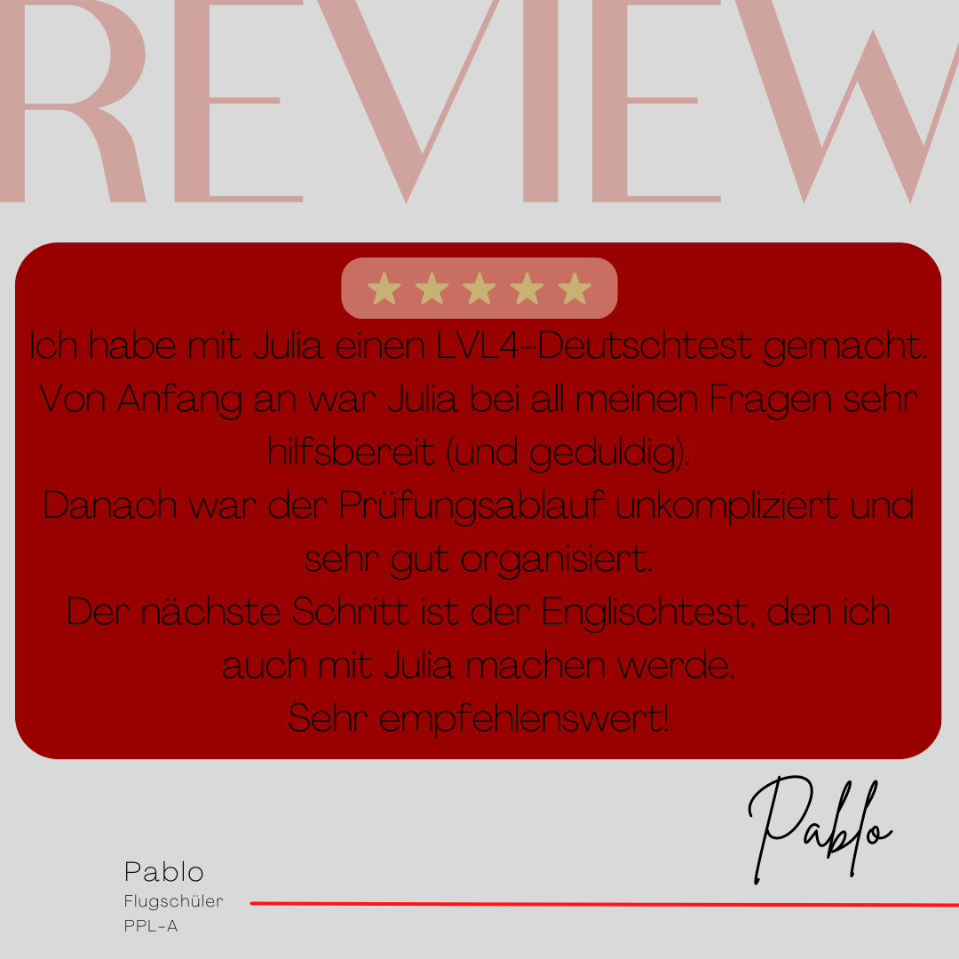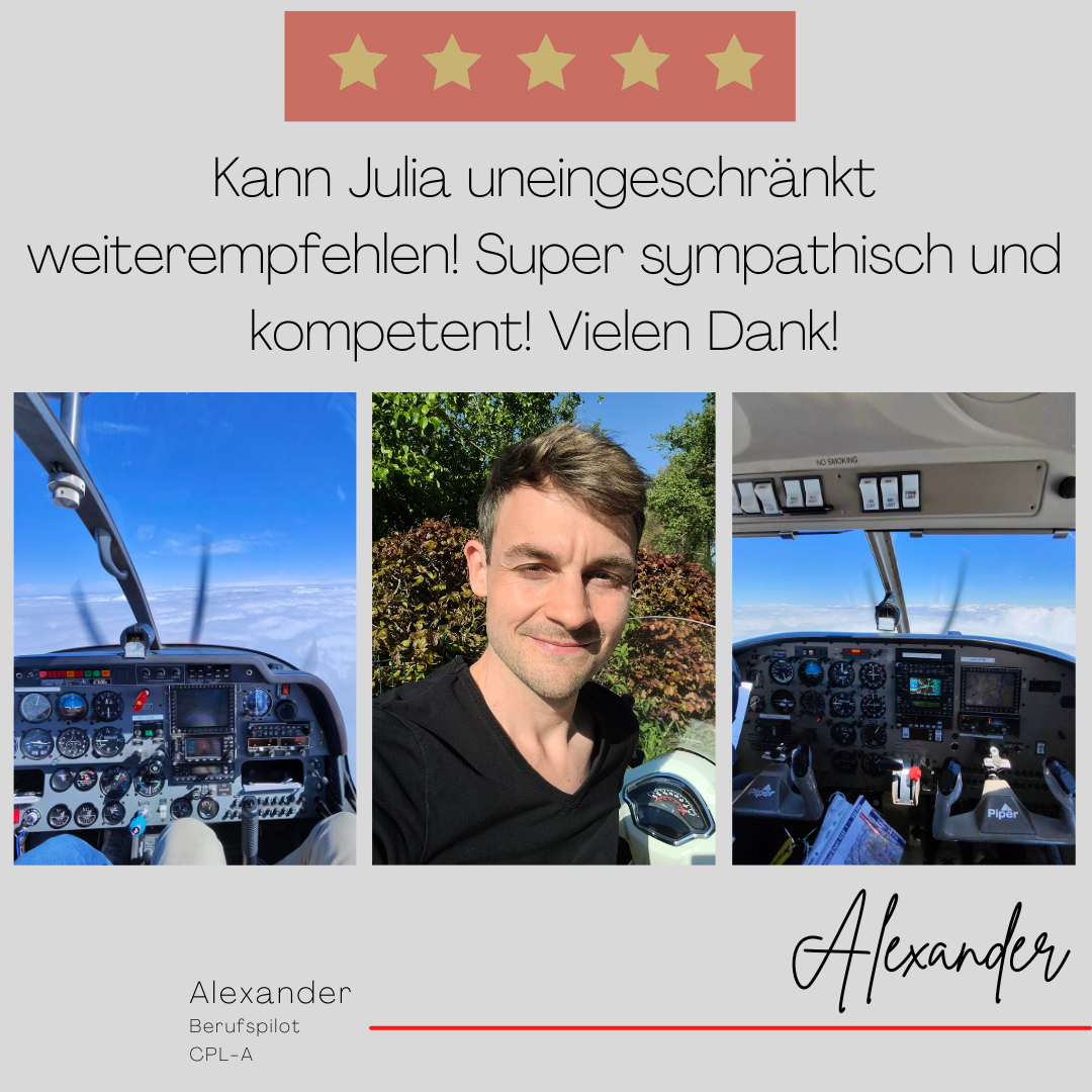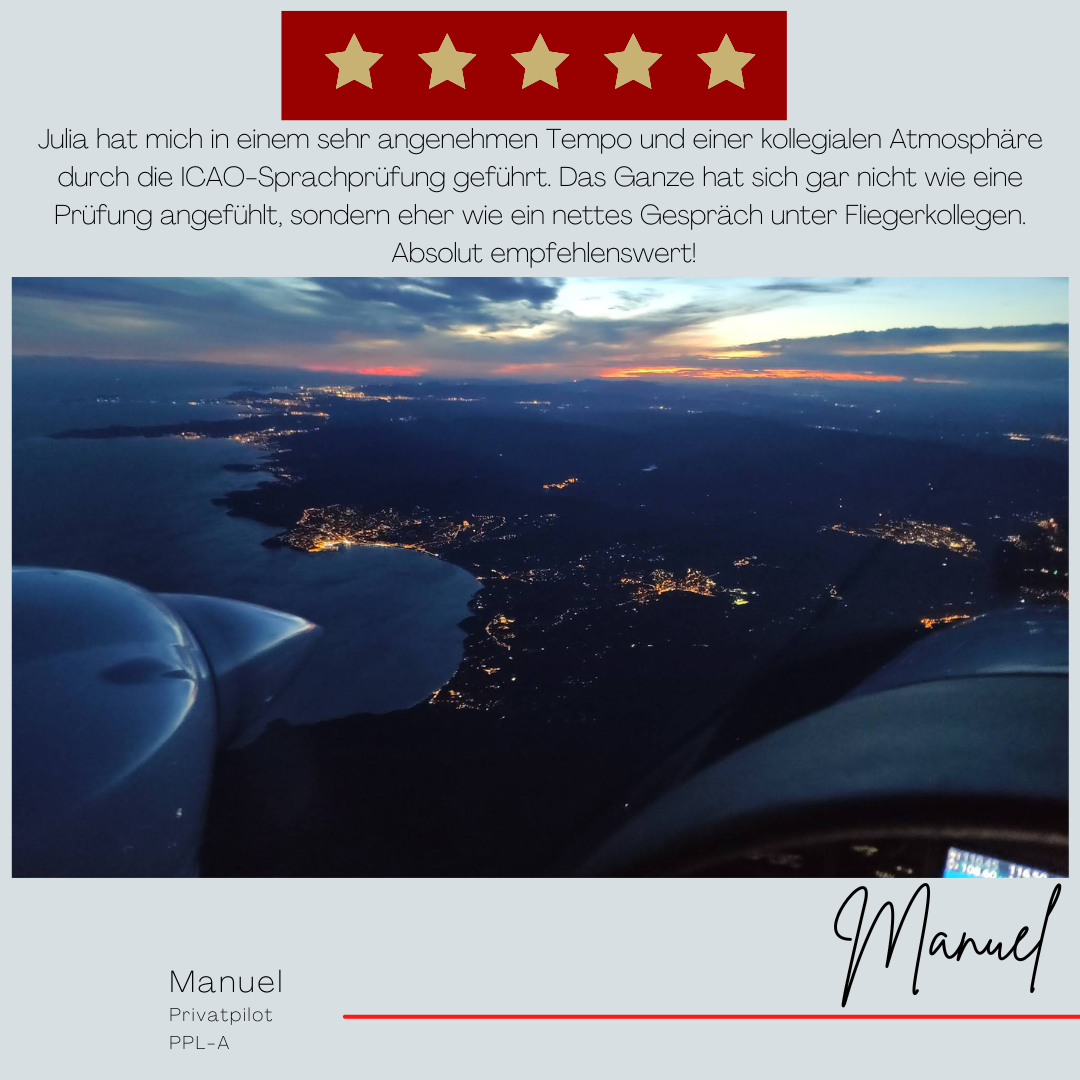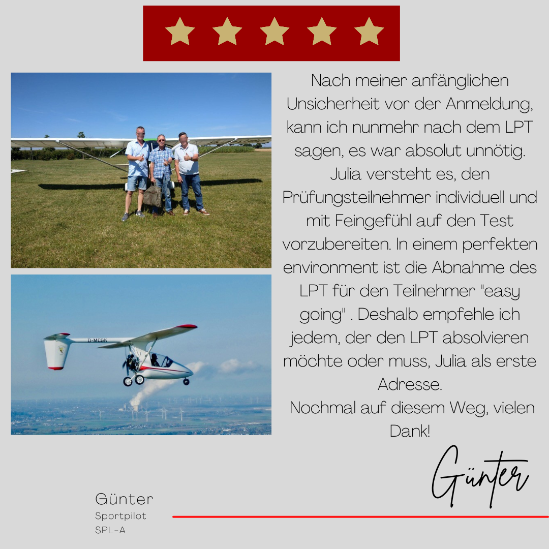 Mein Name ist Julia Engster-Juhas. Ich spreche fließend Englisch auf Expertenniveau (Level 6). Nach meinem Lehramtsstudium begann ich mit dem Flugschein. Nachdem ich diesen absolviert hatte, vertiefte ich meine Kenntnisse in der Flugtheorie und wurde Theorielehrerin.