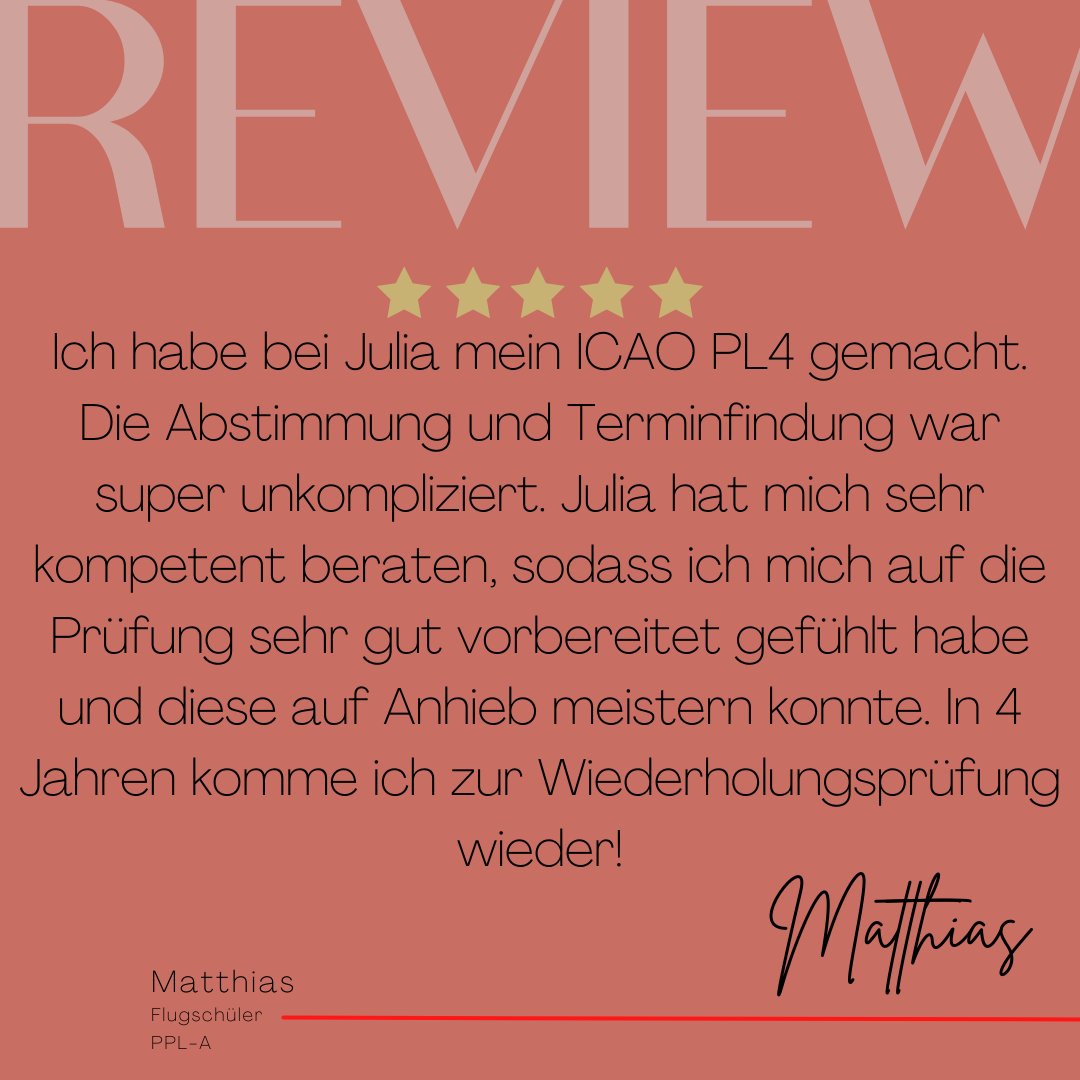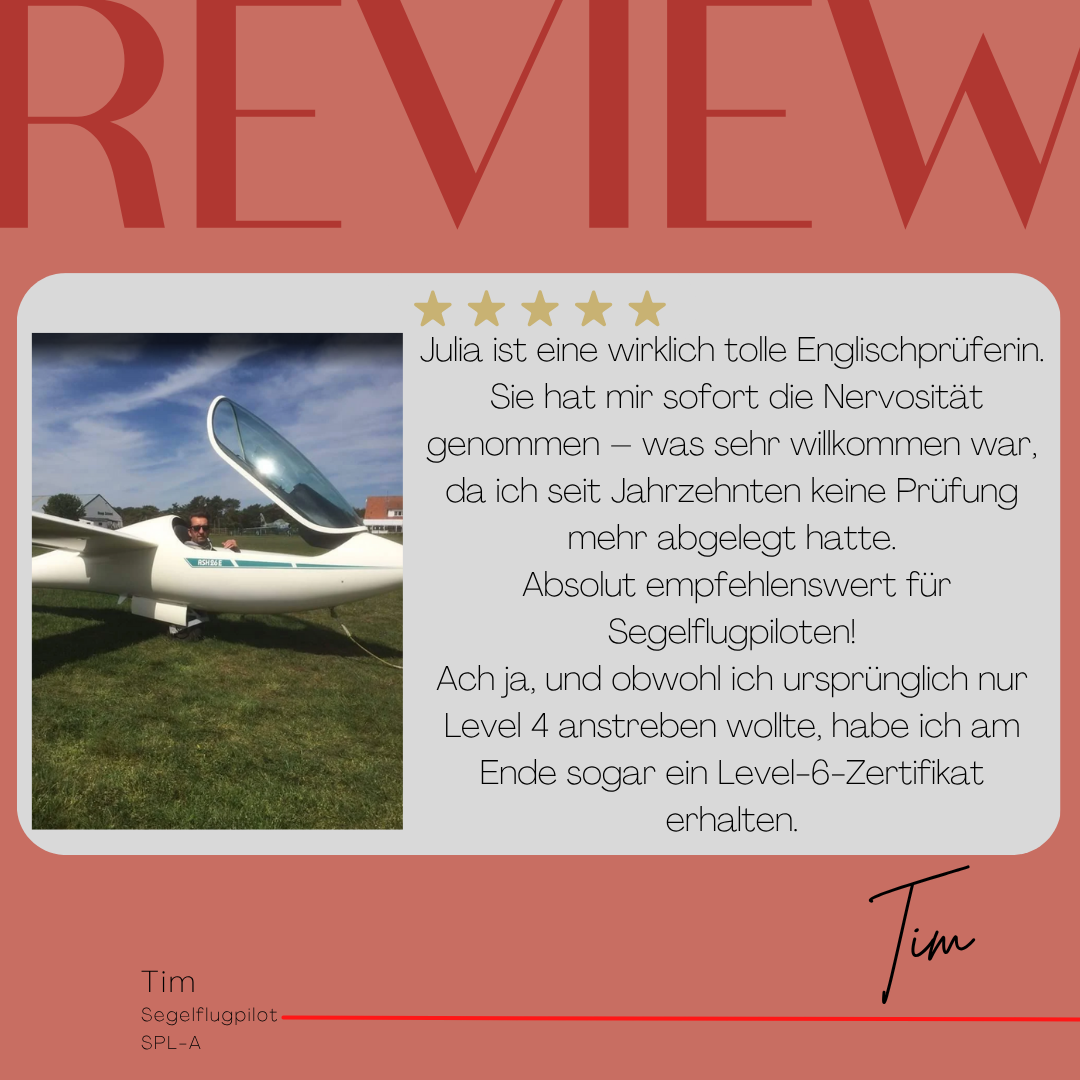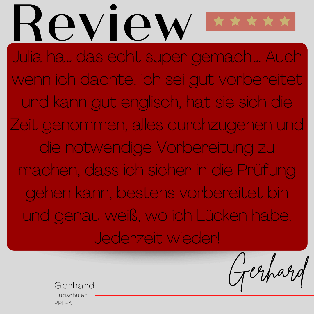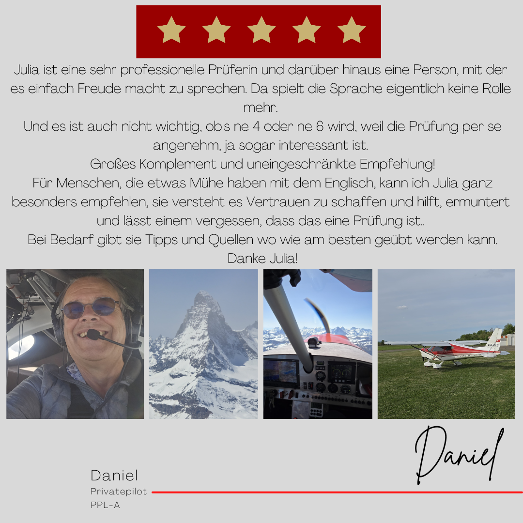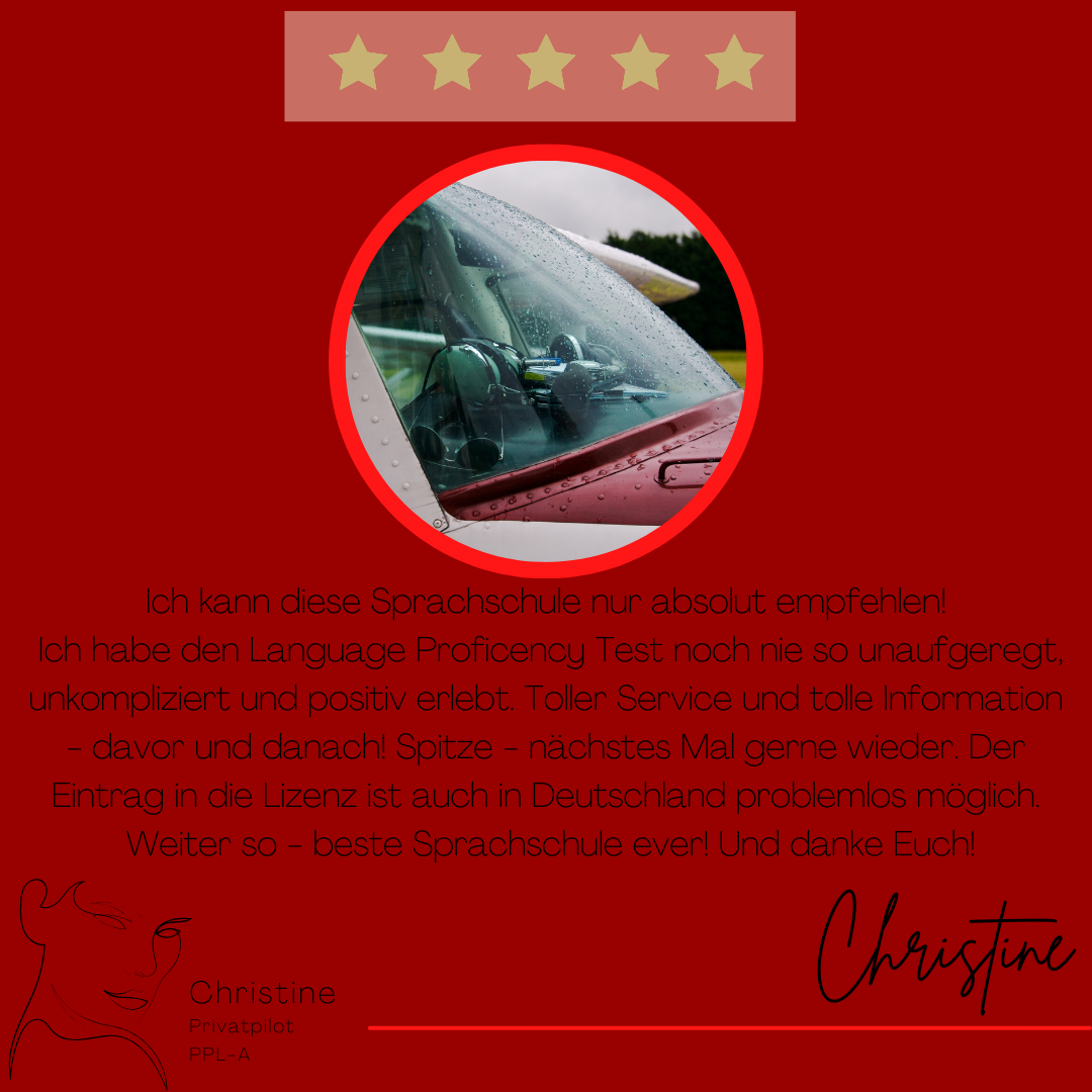 Mein Name ist Julia Engster-Juhas. Ich spreche fließend Englisch auf Expertenniveau (Level 6). Nach meinem Lehramtsstudium begann ich mit dem Flugschein. Nachdem ich diesen absolviert hatte, vertiefte ich meine Kenntnisse in der Flugtheorie und wurde Theorielehrerin.
