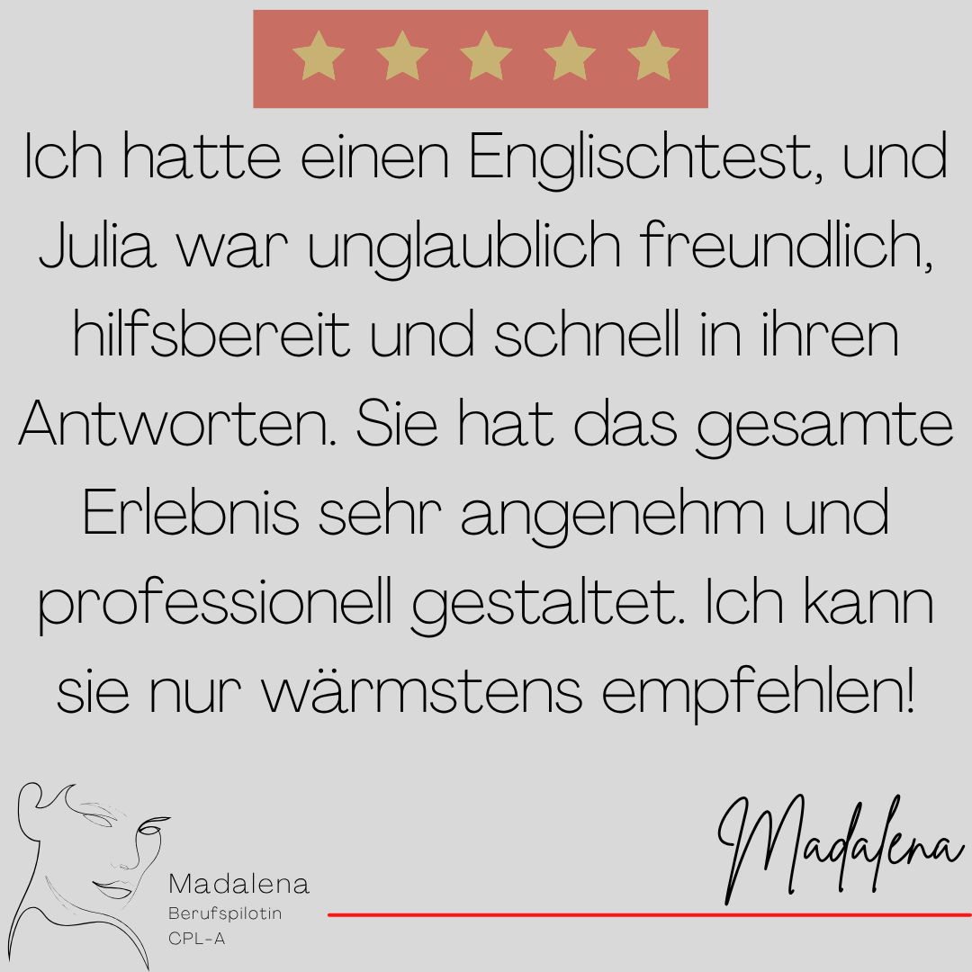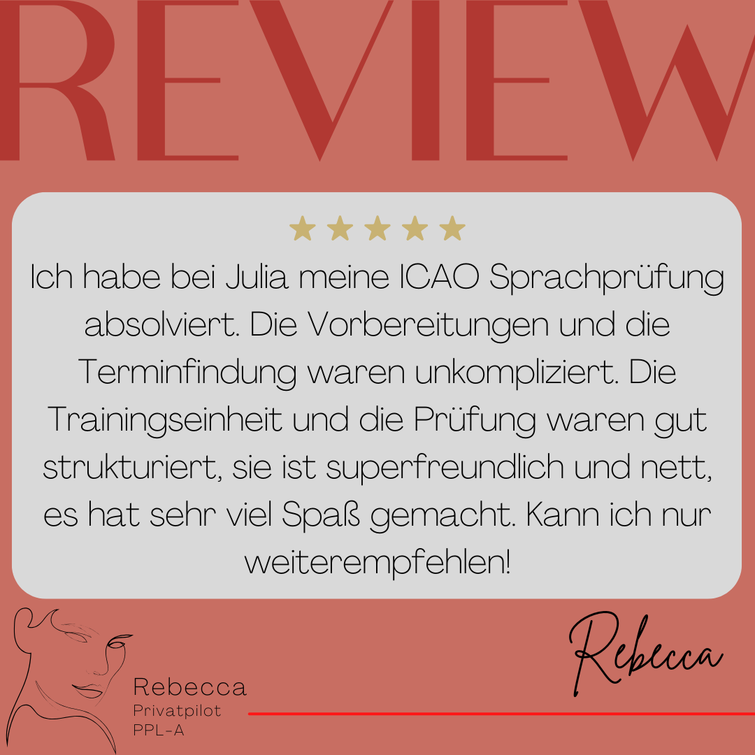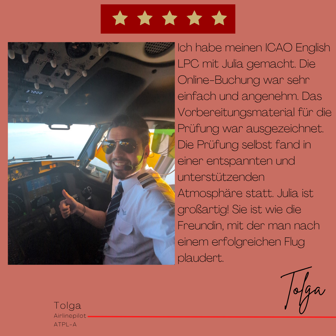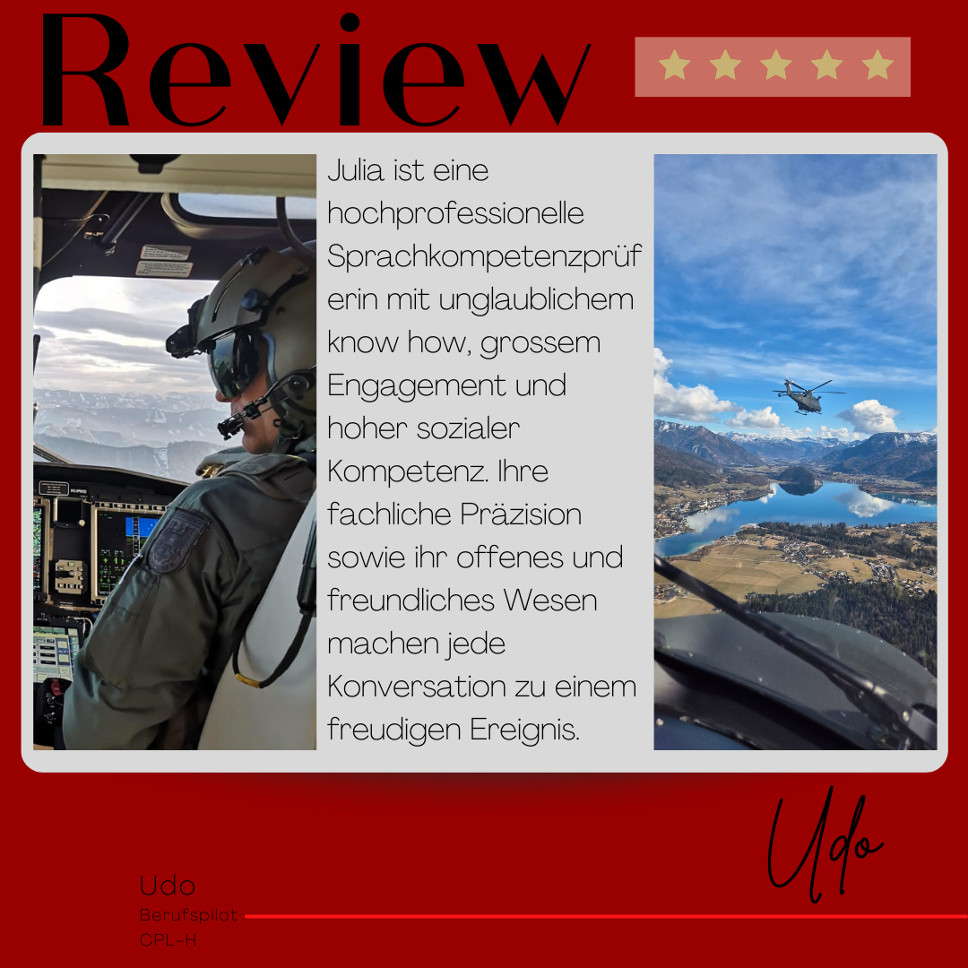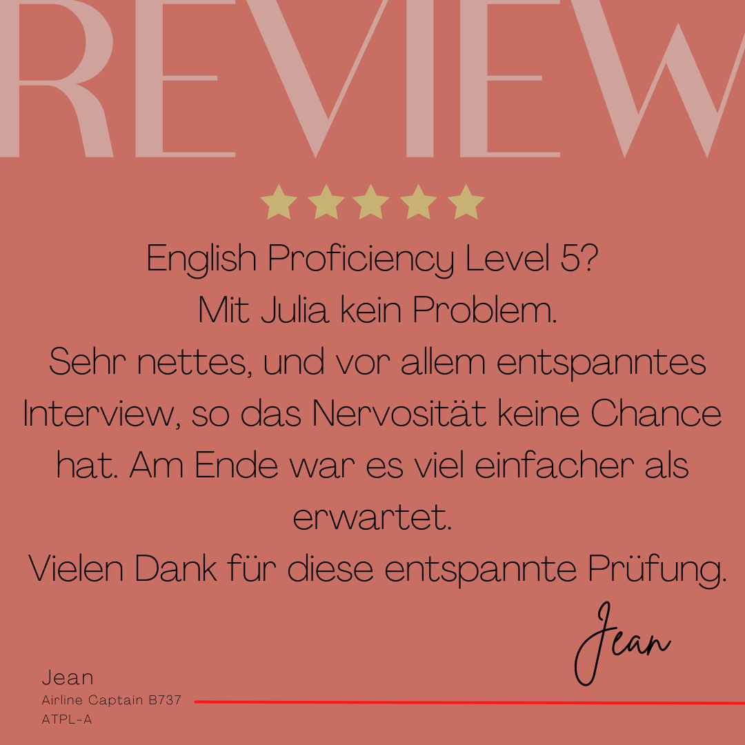 Mein Name ist Julia Engster-Juhas. Ich spreche fließend Englisch auf Expertenniveau (Level 6). Nach meinem Lehramtsstudium begann ich mit dem Flugschein. Nachdem ich diesen absolviert hatte, vertiefte ich meine Kenntnisse in der Flugtheorie und wurde Theorielehrerin.