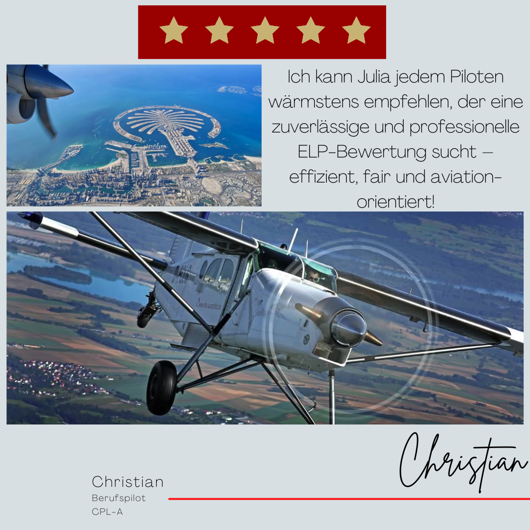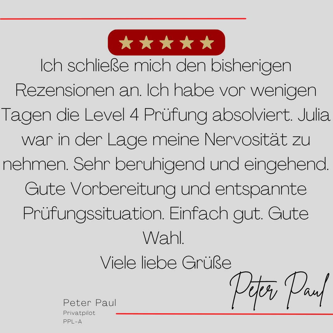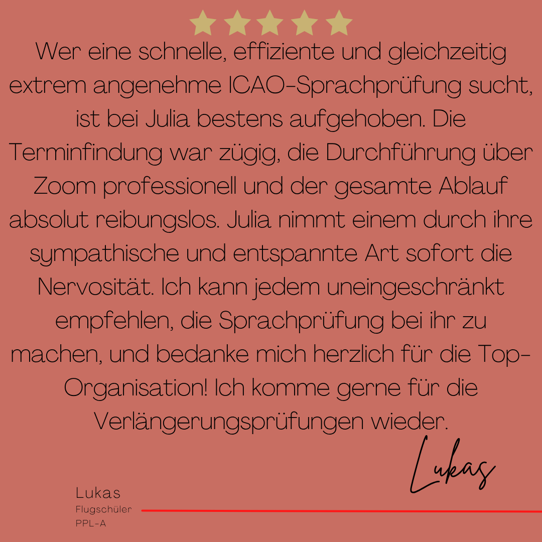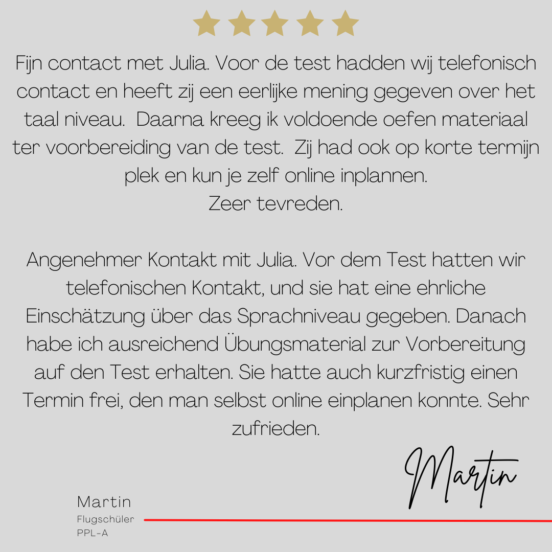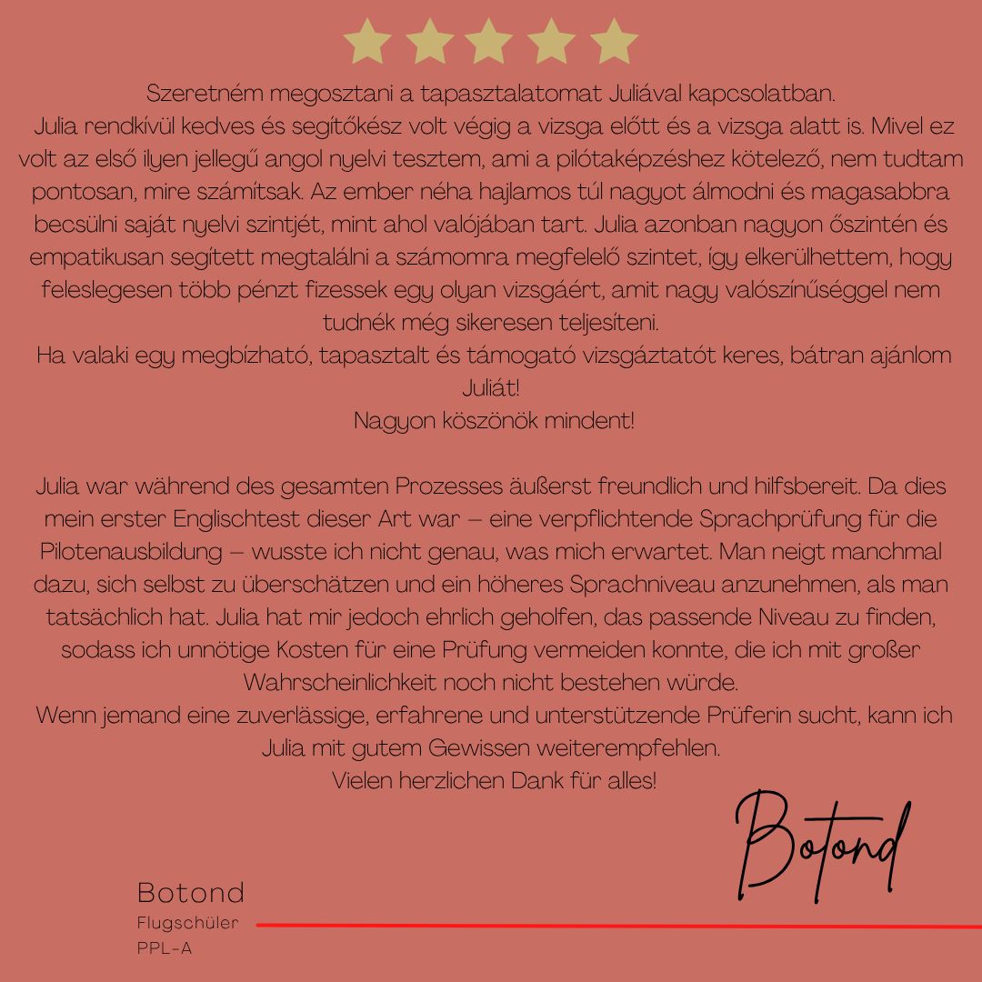 Mein Name ist Julia Engster-Juhas. Ich spreche fließend Englisch auf Expertenniveau (Level 6). Nach meinem Lehramtsstudium begann ich mit dem Flugschein. Nachdem ich diesen absolviert hatte, vertiefte ich meine Kenntnisse in der Flugtheorie und wurde Theorielehrerin.