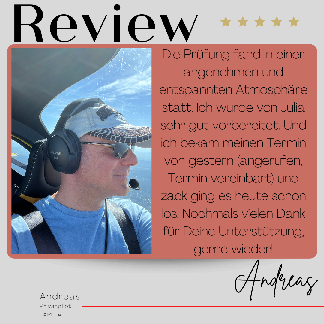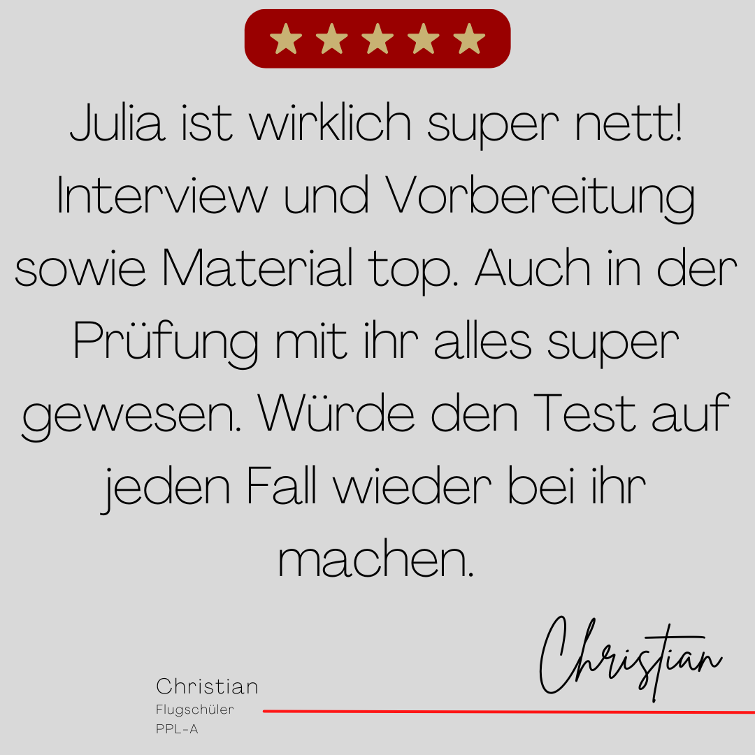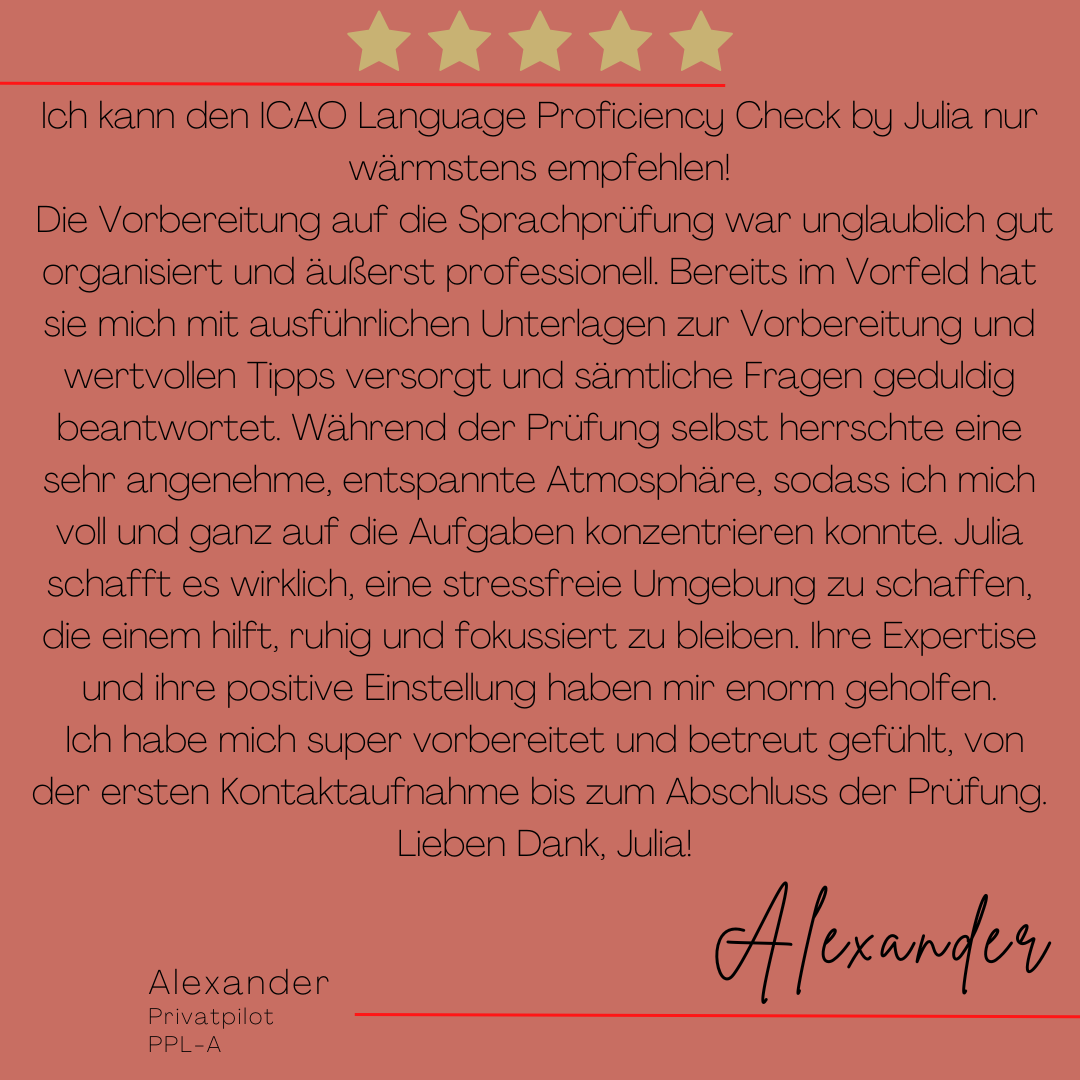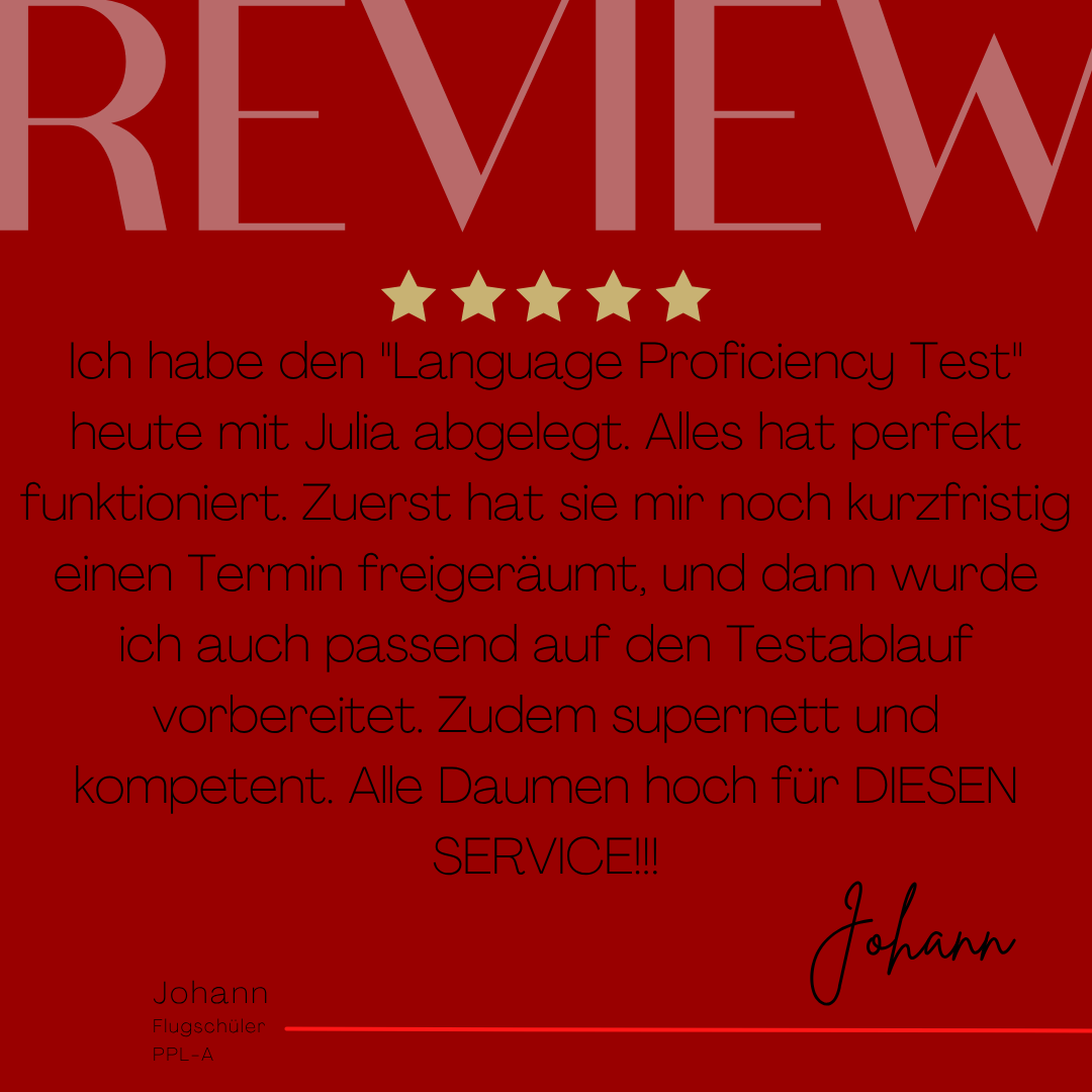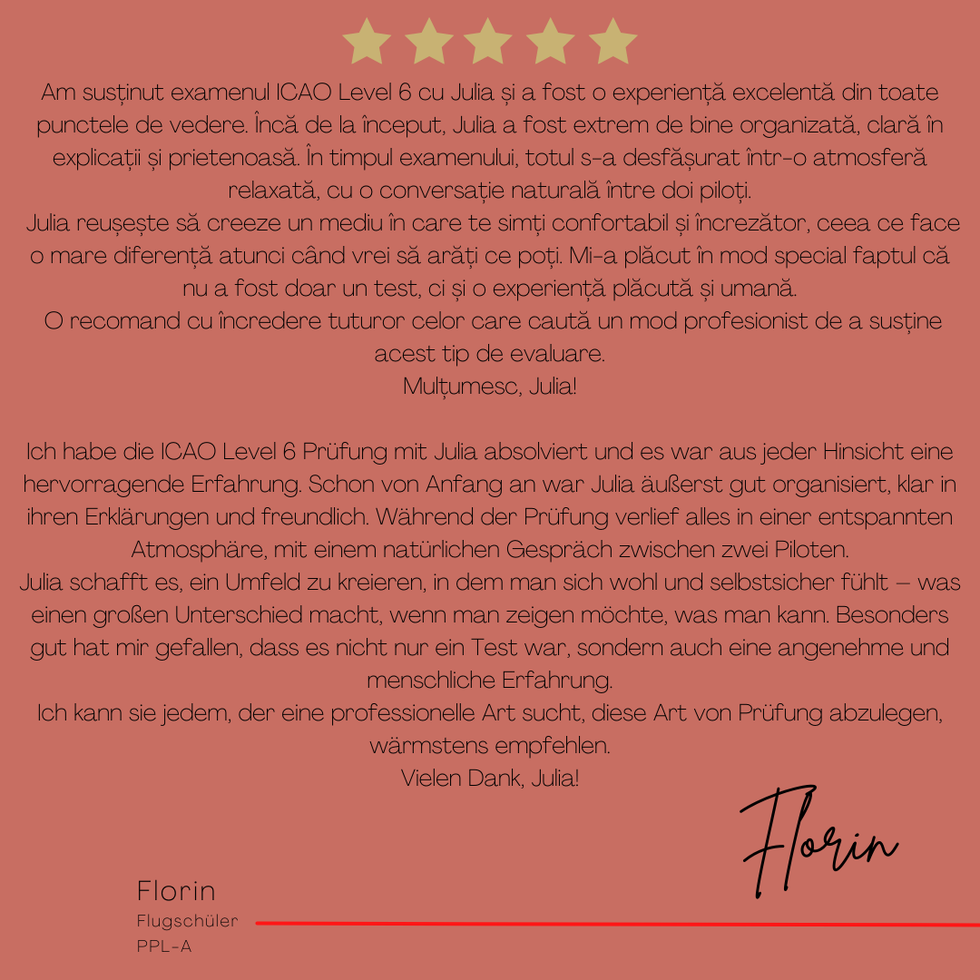 Mein Name ist Julia Engster-Juhas. Ich spreche fließend Englisch auf Expertenniveau (Level 6). Nach meinem Lehramtsstudium begann ich mit dem Flugschein. Nachdem ich diesen absolviert hatte, vertiefte ich meine Kenntnisse in der Flugtheorie und wurde Theorielehrerin.