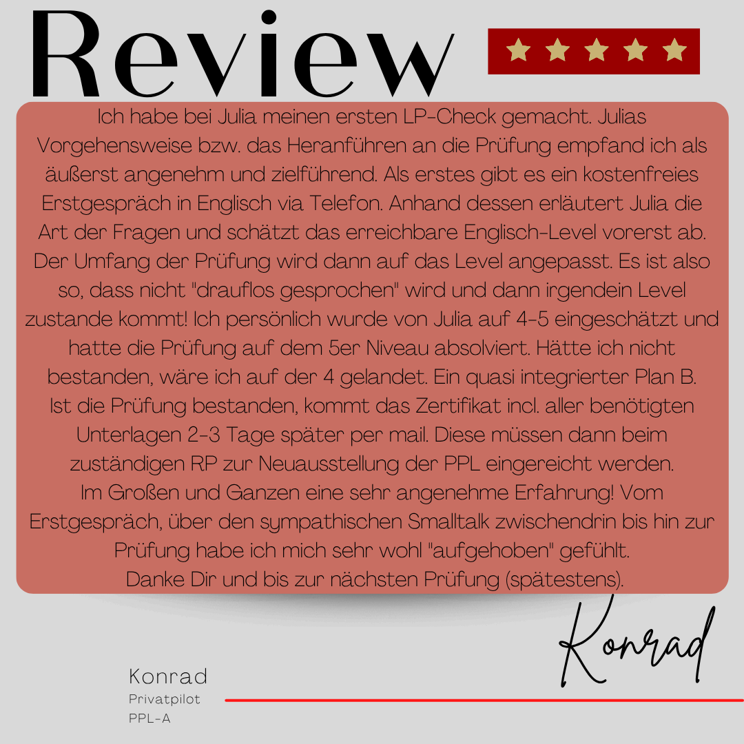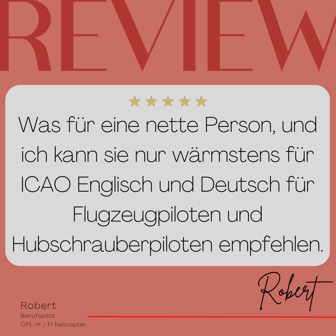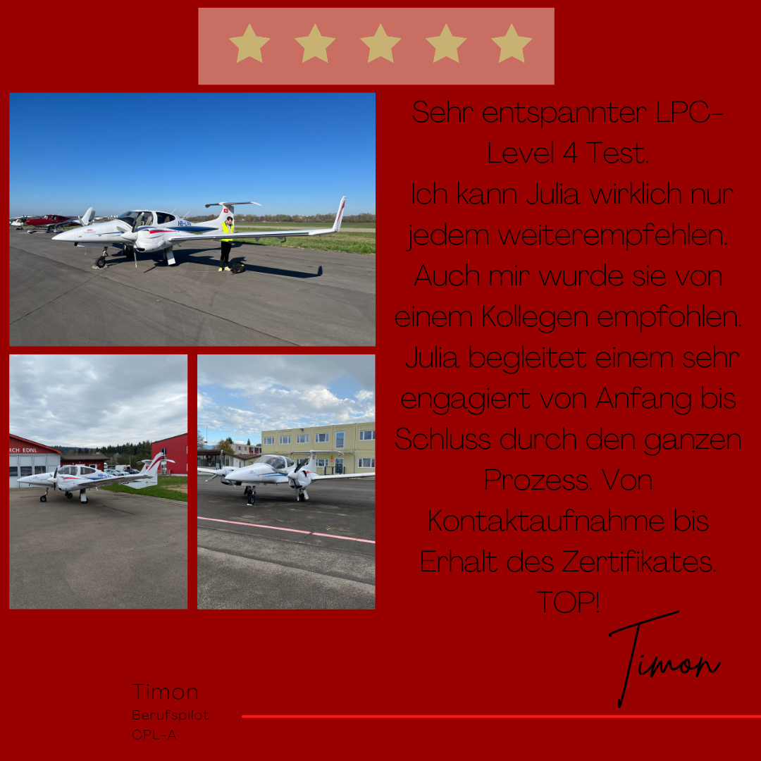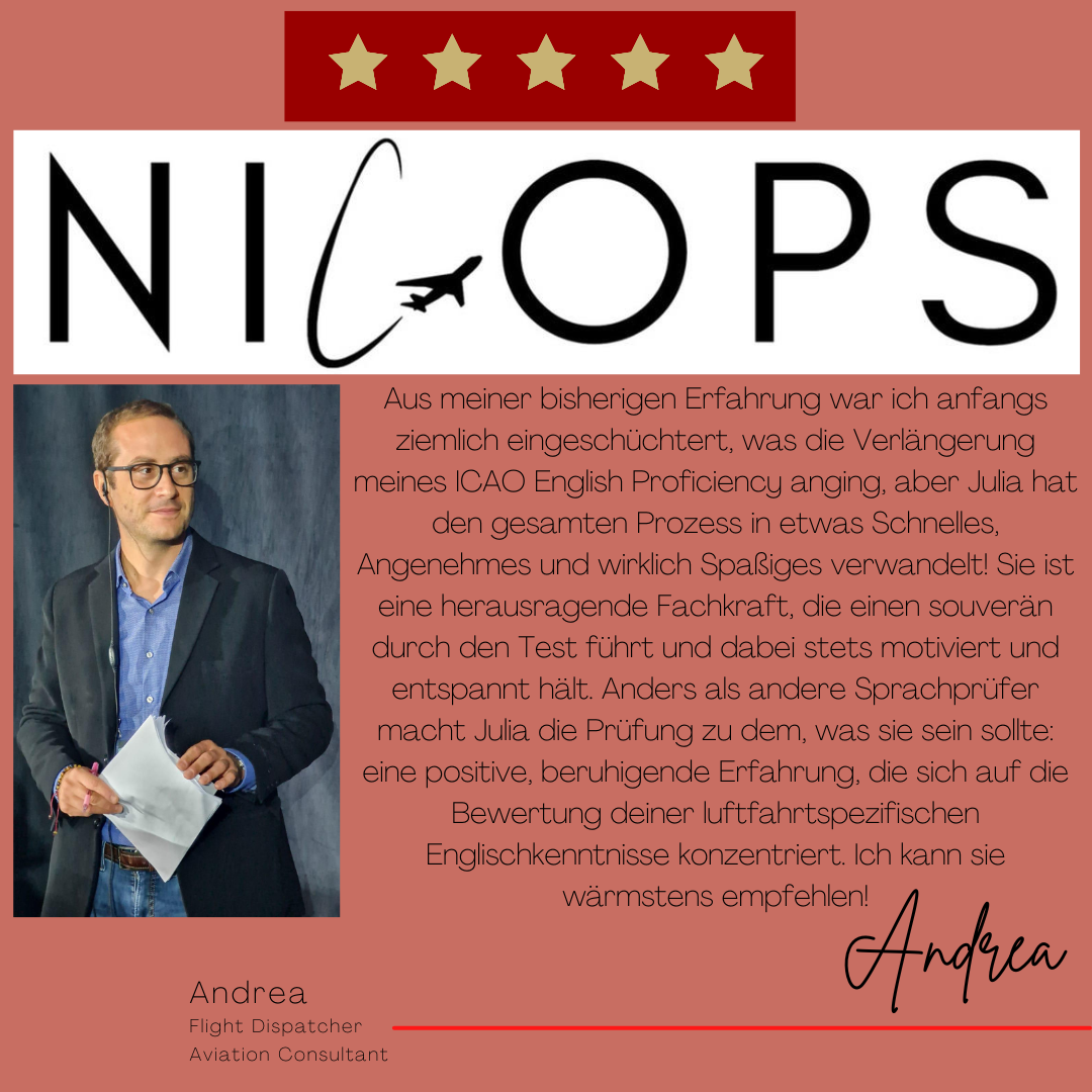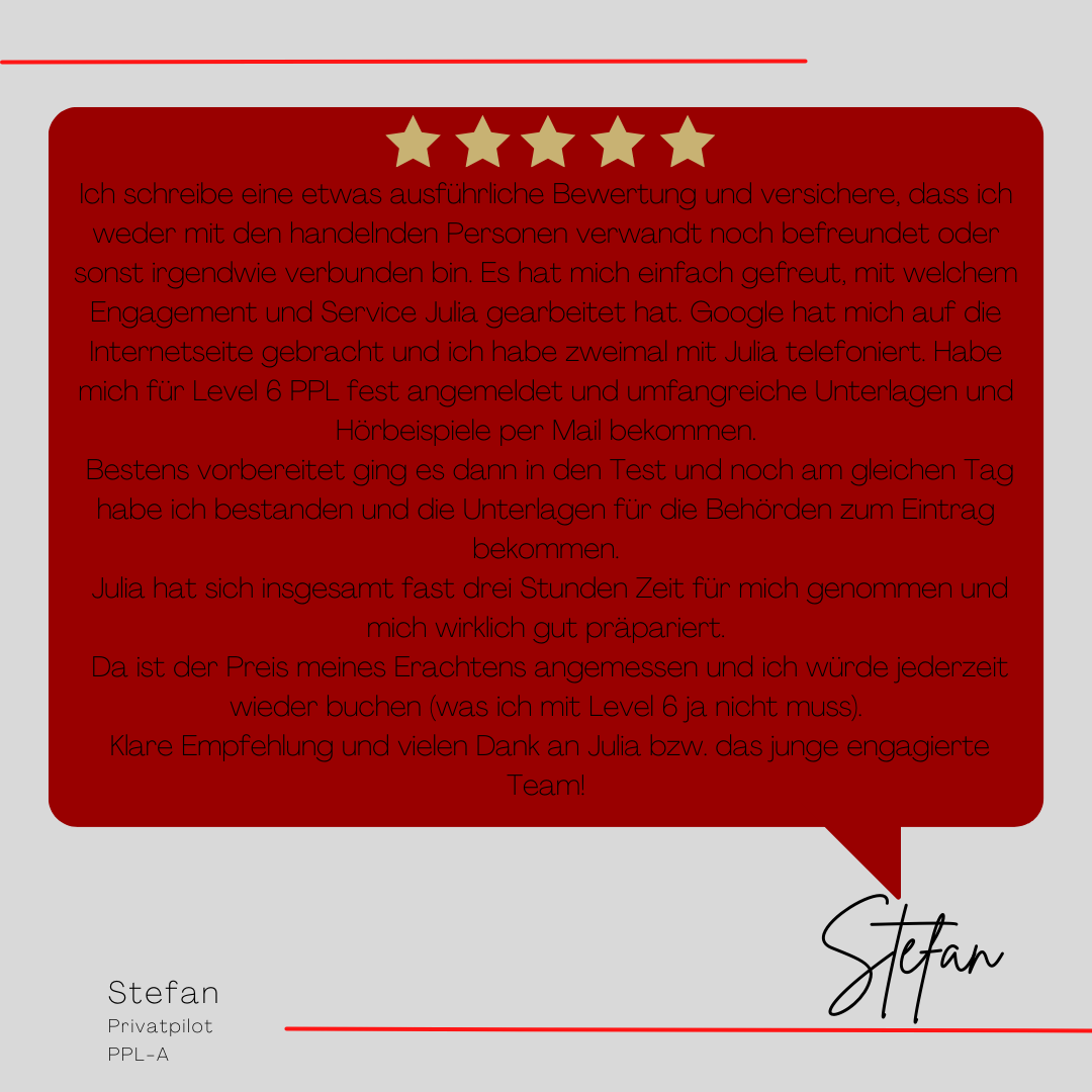 Mein Name ist Julia Engster-Juhas. Ich spreche fließend Englisch auf Expertenniveau (Level 6). Nach meinem Lehramtsstudium begann ich mit dem Flugschein. Nachdem ich diesen absolviert hatte, vertiefte ich meine Kenntnisse in der Flugtheorie und wurde Theorielehrerin.