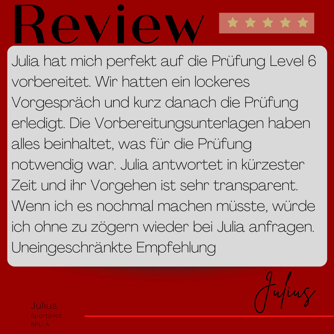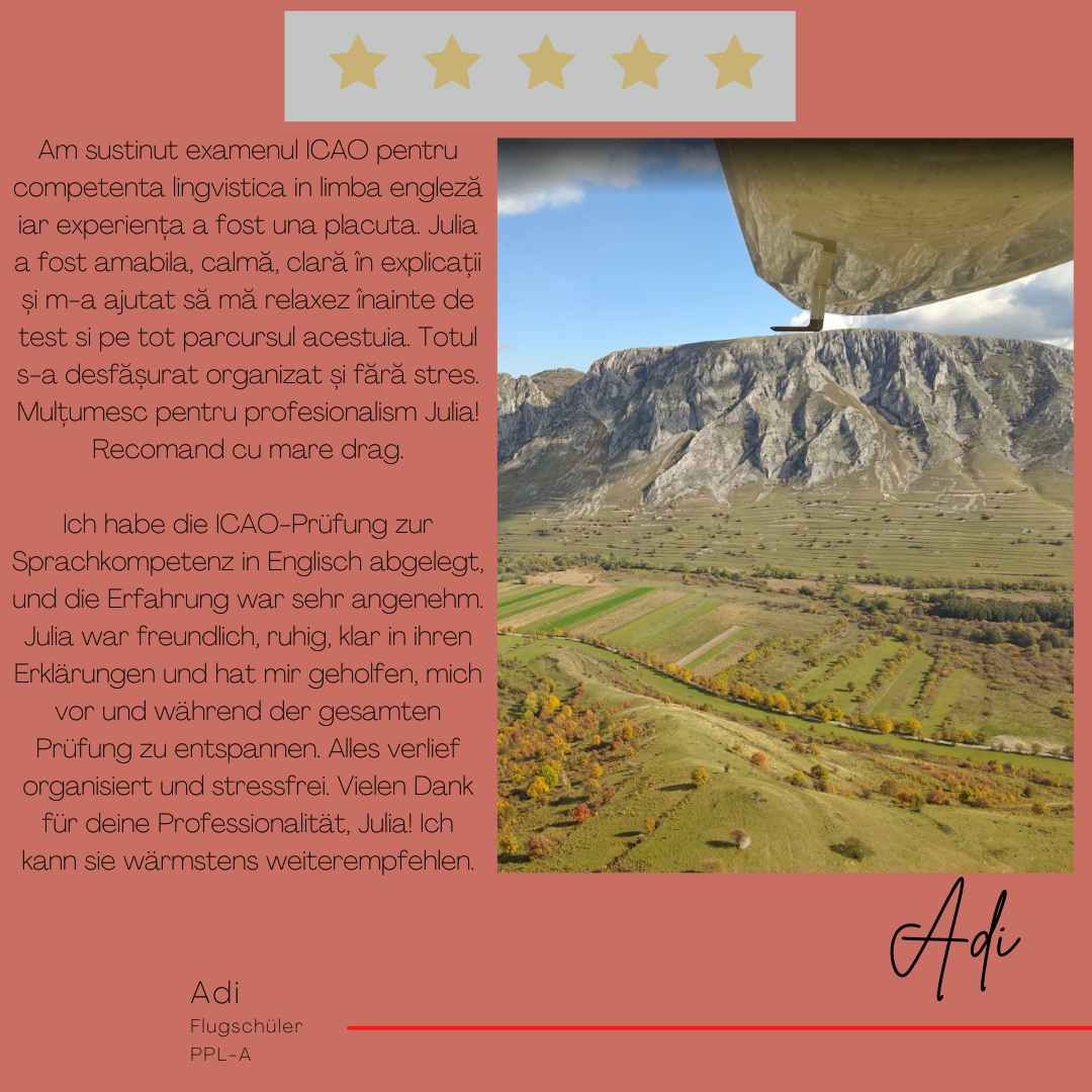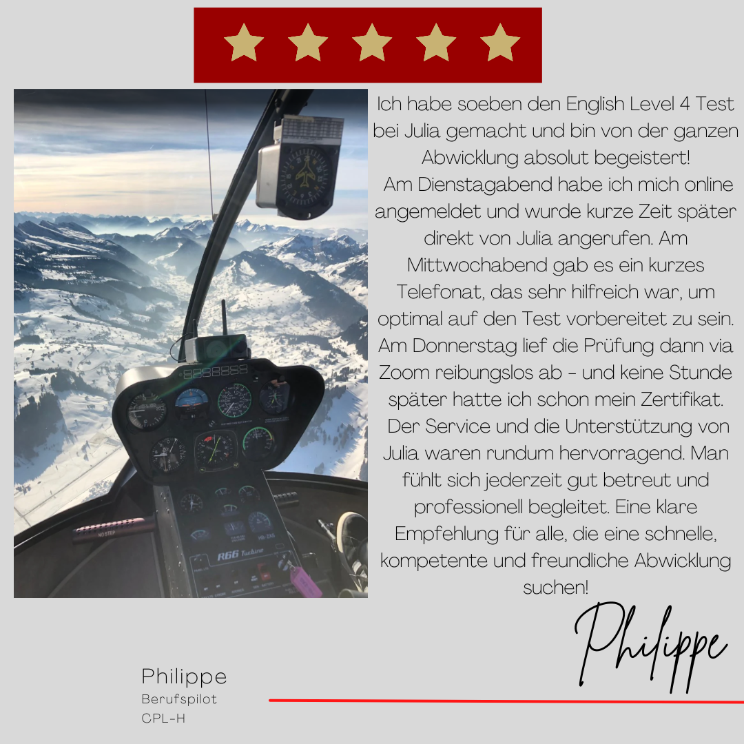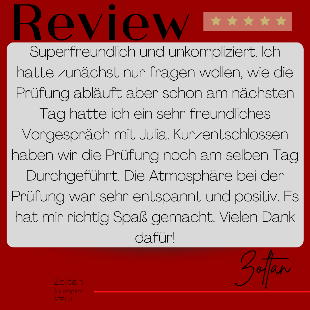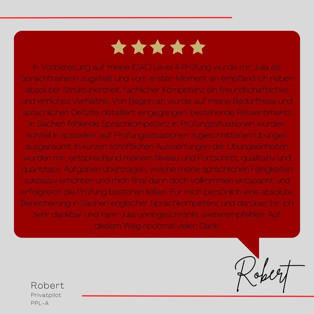 Mein Name ist Julia Engster-Juhas. Ich spreche fließend Englisch auf Expertenniveau (Level 6). Nach meinem Lehramtsstudium begann ich mit dem Flugschein. Nachdem ich diesen absolviert hatte, vertiefte ich meine Kenntnisse in der Flugtheorie und wurde Theorielehrerin.