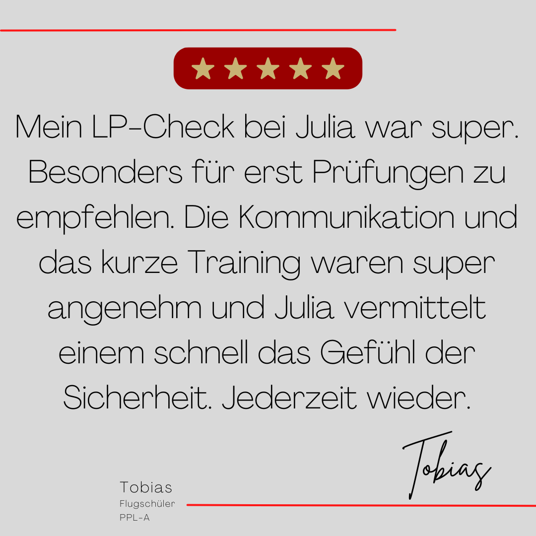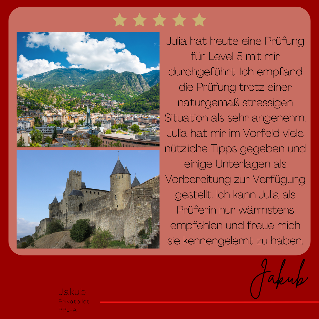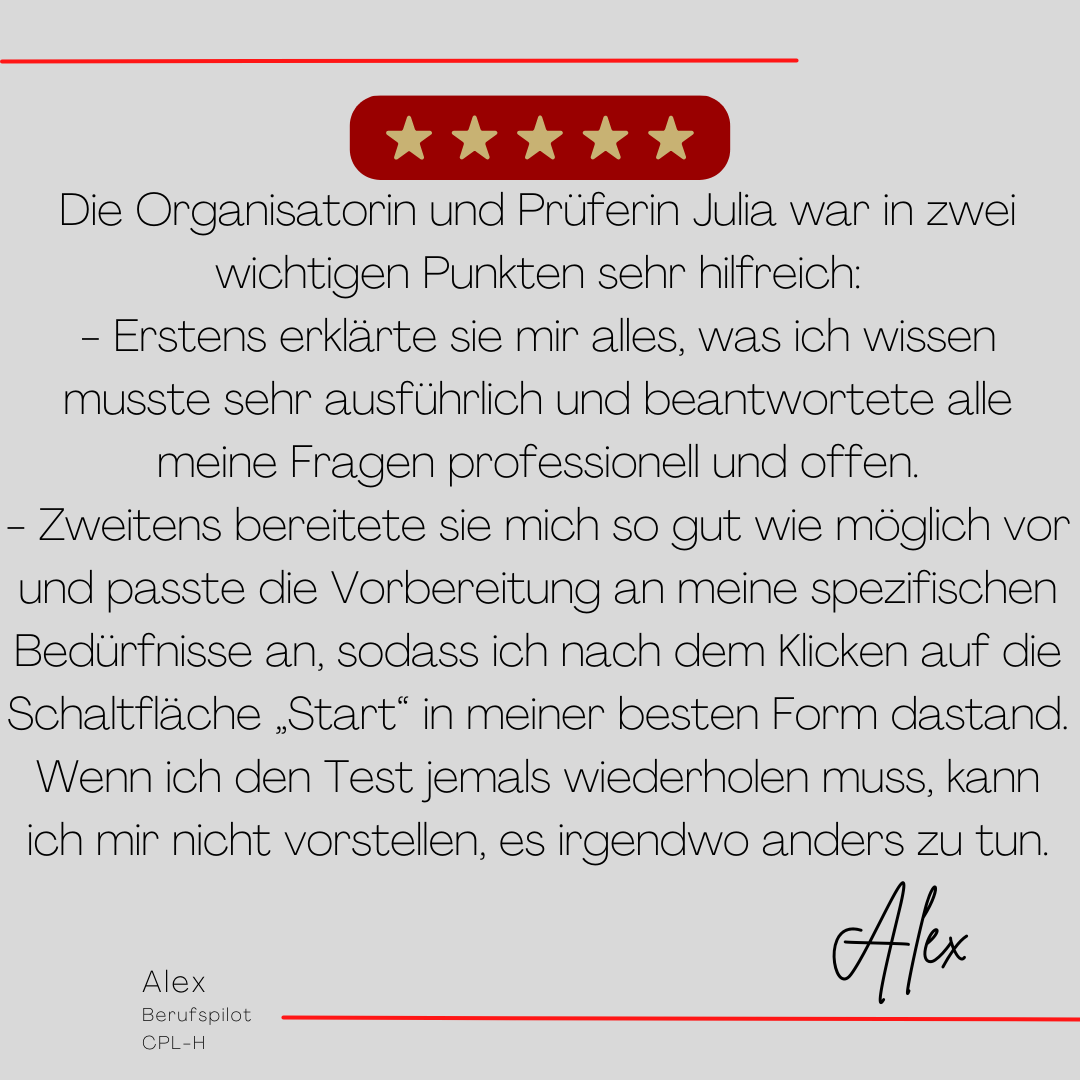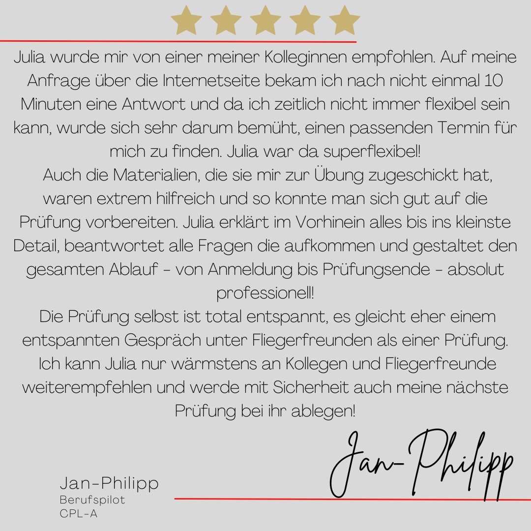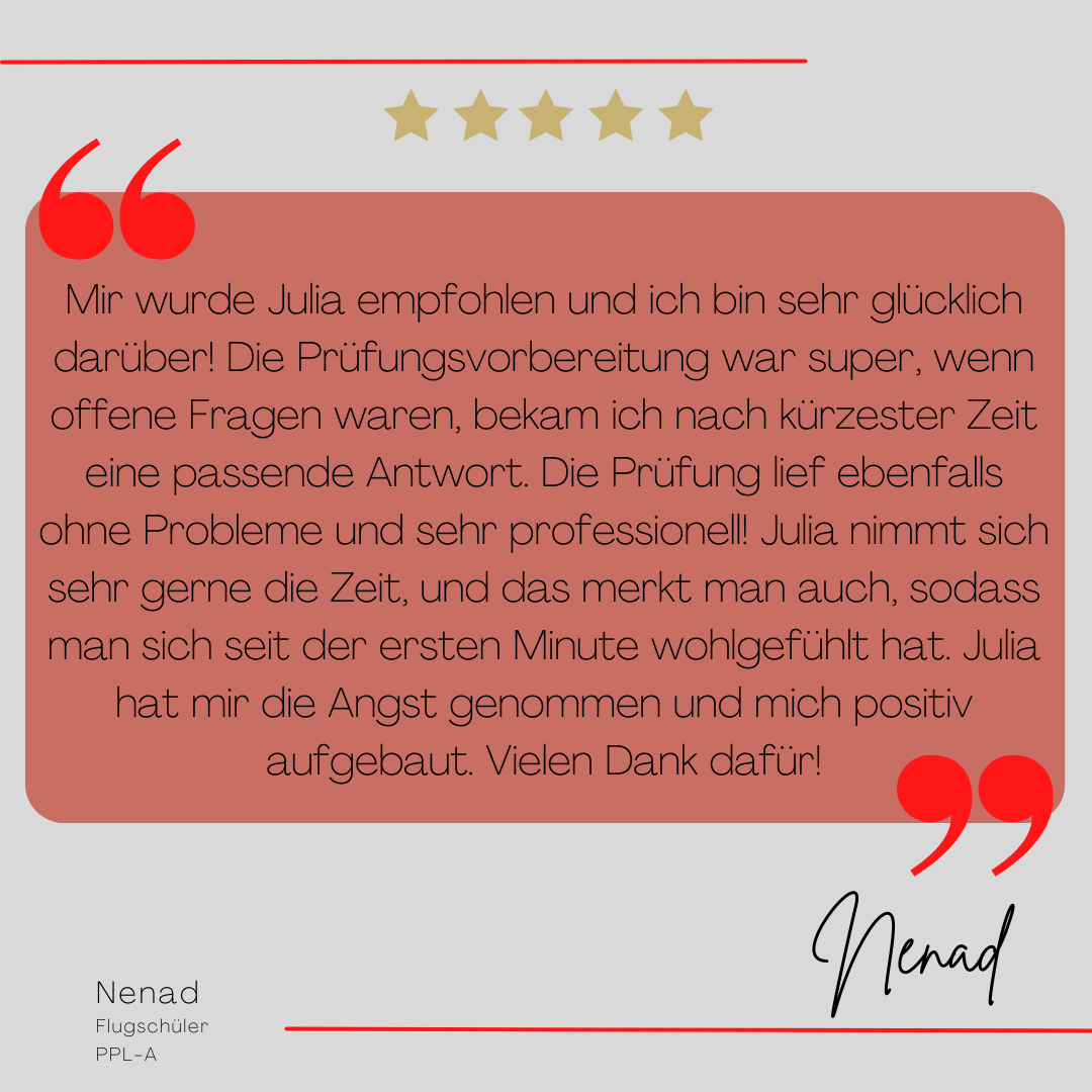 Mein Name ist Julia Engster-Juhas. Ich spreche fließend Englisch auf Expertenniveau (Level 6). Nach meinem Lehramtsstudium begann ich mit dem Flugschein. Nachdem ich diesen absolviert hatte, vertiefte ich meine Kenntnisse in der Flugtheorie und wurde Theorielehrerin.