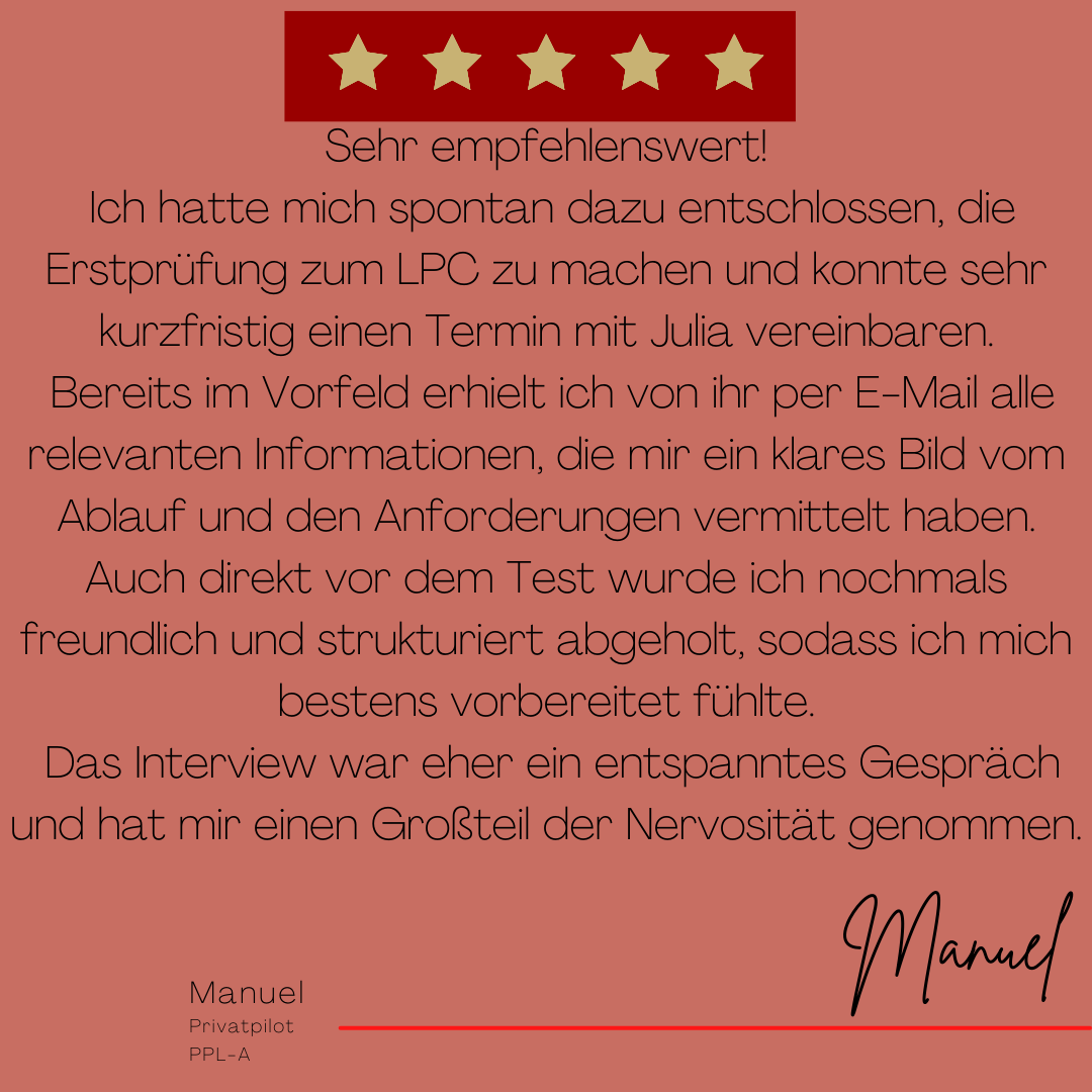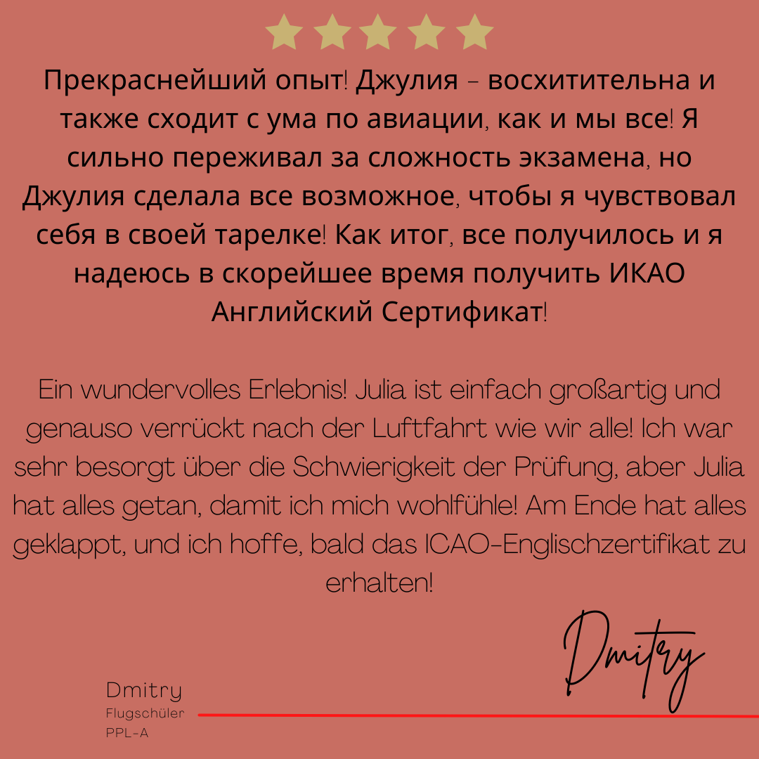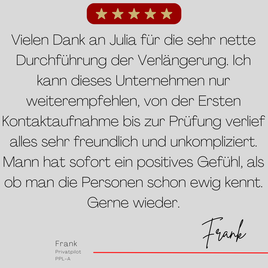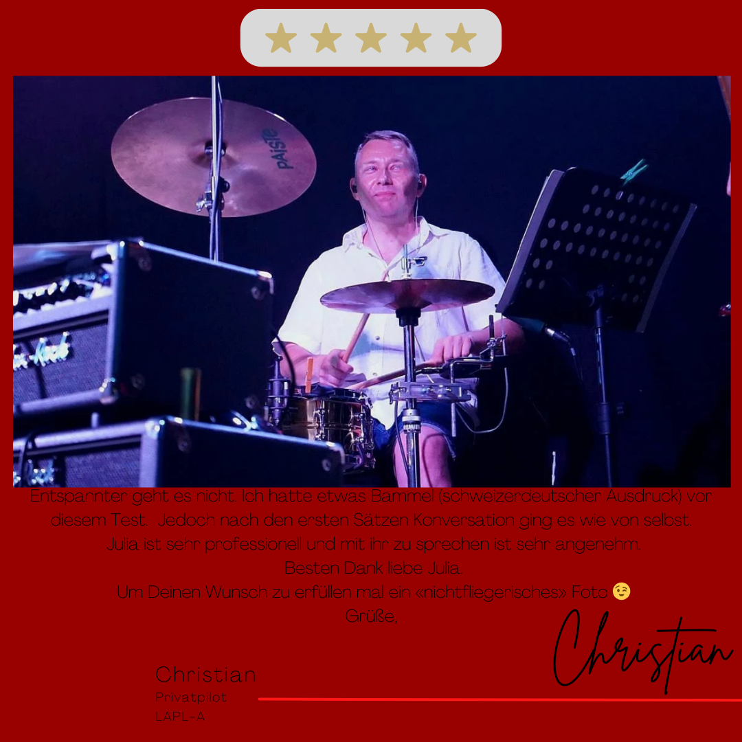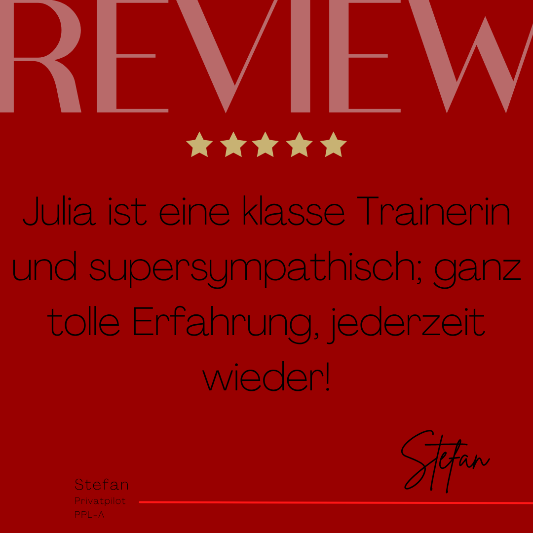 Mein Name ist Julia Engster-Juhas. Ich spreche fließend Englisch auf Expertenniveau (Level 6). Nach meinem Lehramtsstudium begann ich mit dem Flugschein. Nachdem ich diesen absolviert hatte, vertiefte ich meine Kenntnisse in der Flugtheorie und wurde Theorielehrerin.