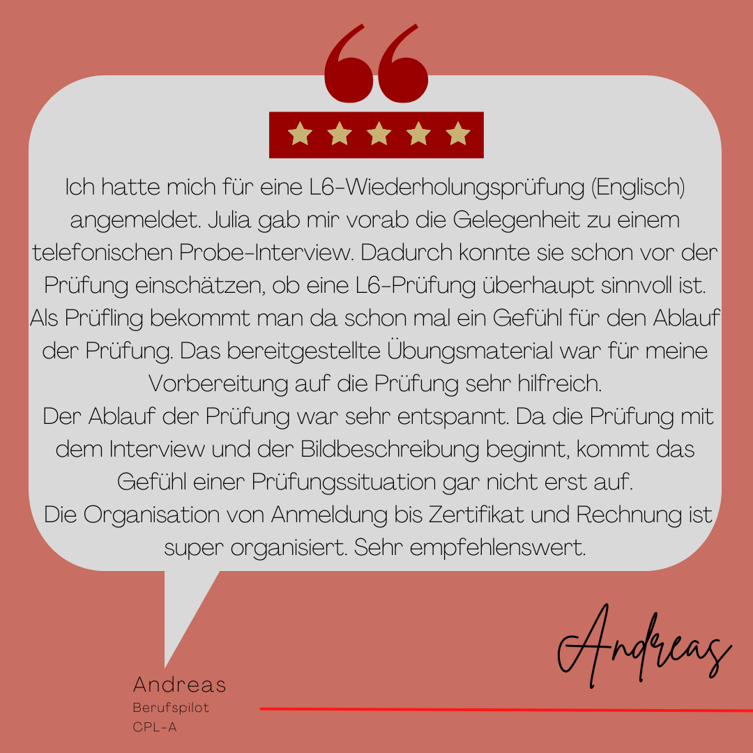 Du bist etwas aus der Übung oder Dir nicht ganz sicher, wie Du Deine englischen Sprachfähigkeiten einschätzen sollst? Sei ganz beruhigt, ich helfe Dir. Wir besprechen vorab, wie die Prüfung abläuft und was von Dir erwartet wird.