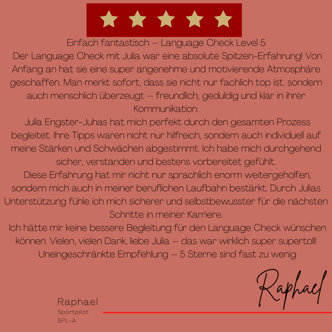 Während der Prüfung unterstütze ich Dich und sorge dafür, dass Du stress- und angstfrei Deinen Language Proficiency Check bestehst.