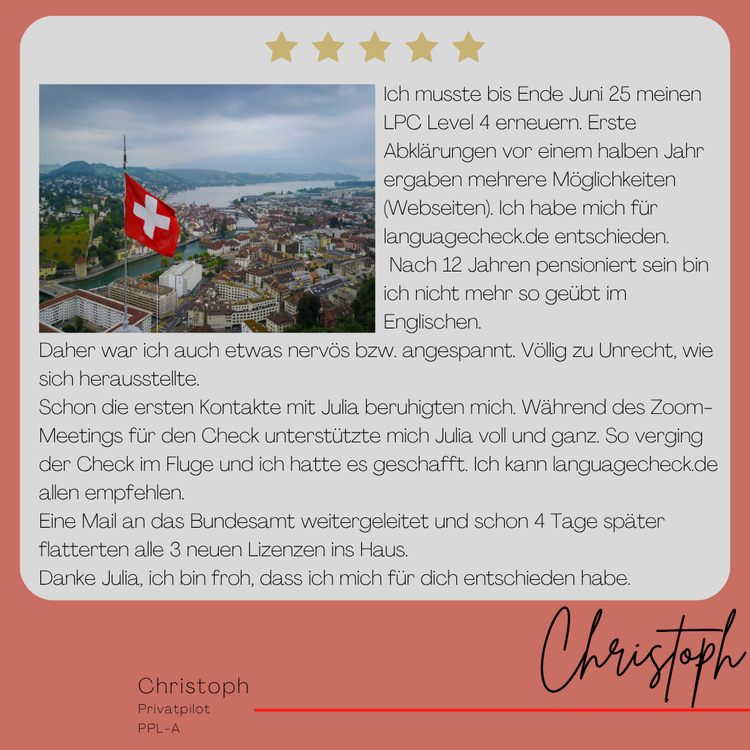 Keine Sorge – ein abgelaufener Spracheintrag ist kein Weltuntergang. Allerdings darfst Du ohne gültigen Eintrag nicht mehr auf Englisch funken oder ins Ausland fliegen. Am besten planst Du die Erneuerung rechtzeitig, damit alles reibungslos weiterläuft. Bist du bei mir im System bereits registriert, kriegst Du automatisch eine Erinnerungsmail, bevor Dein Spracheintrag abläuft. Sollte er doch einmal ablaufen, dann führen wir den Test rasch durch, Du reichst alles bei Deiner Behörde ein, und schon bald erhältst Du Deine neue Lizenz mit aktuellem Spracheintrag.