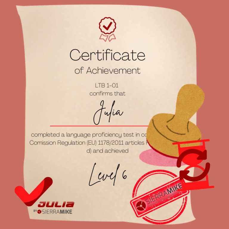 Anschließend ließ ich mich im LTB 1-01 (SierraMike Consulting) zur Sprachprüferin ausbilden und erhielt die Lizenz zur Abnahme der Sprachprüfung in Englisch und Deutsch bis Level 6 und bin lizenzierte ICAO Sprachkompetenzprüferin gemäß ICAO Doc 9853.